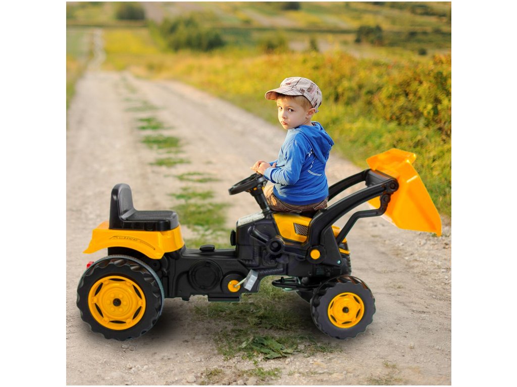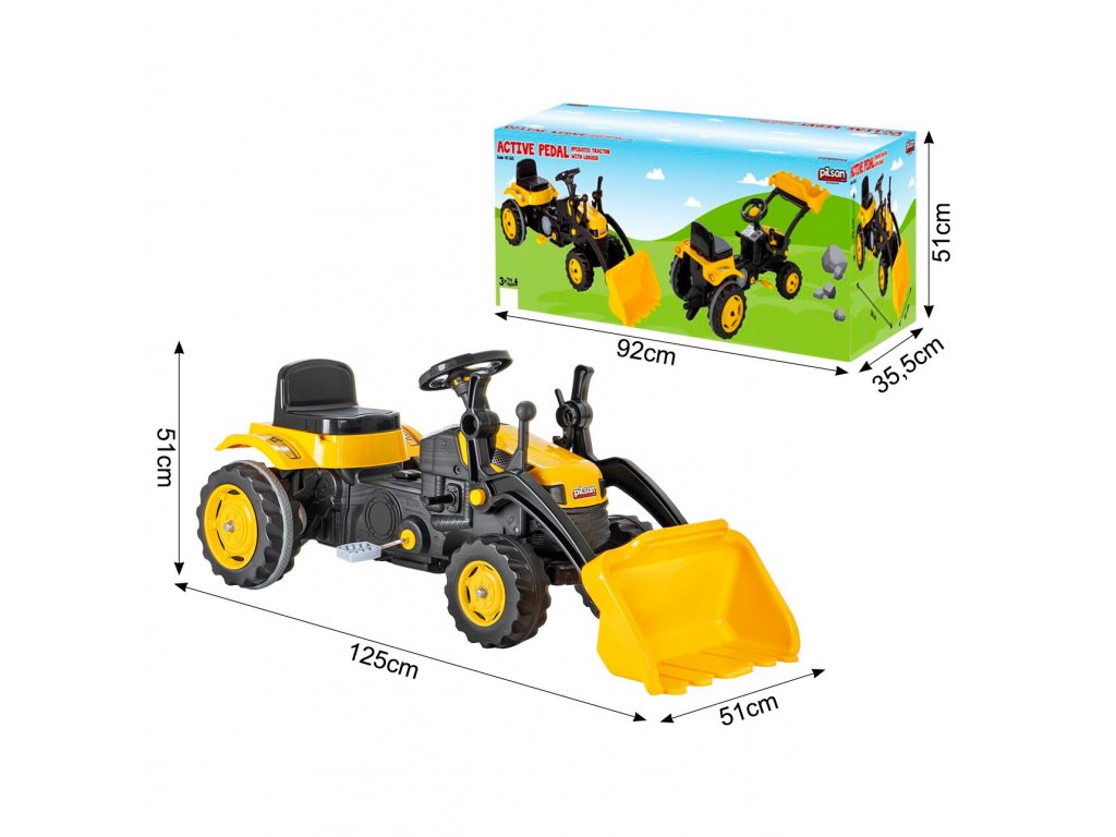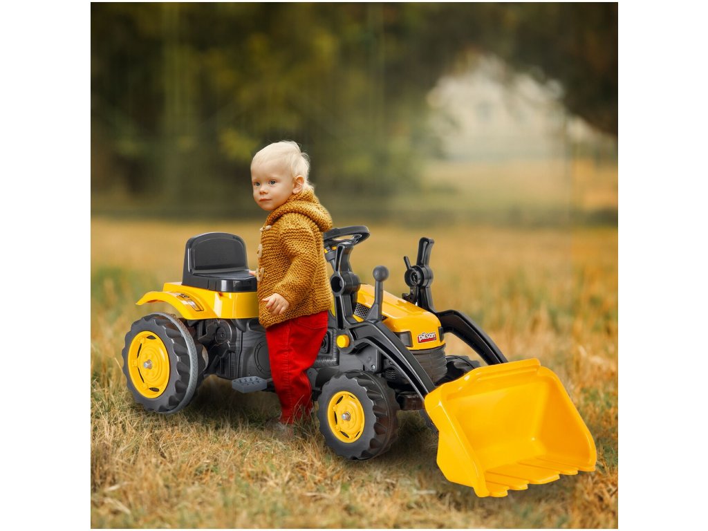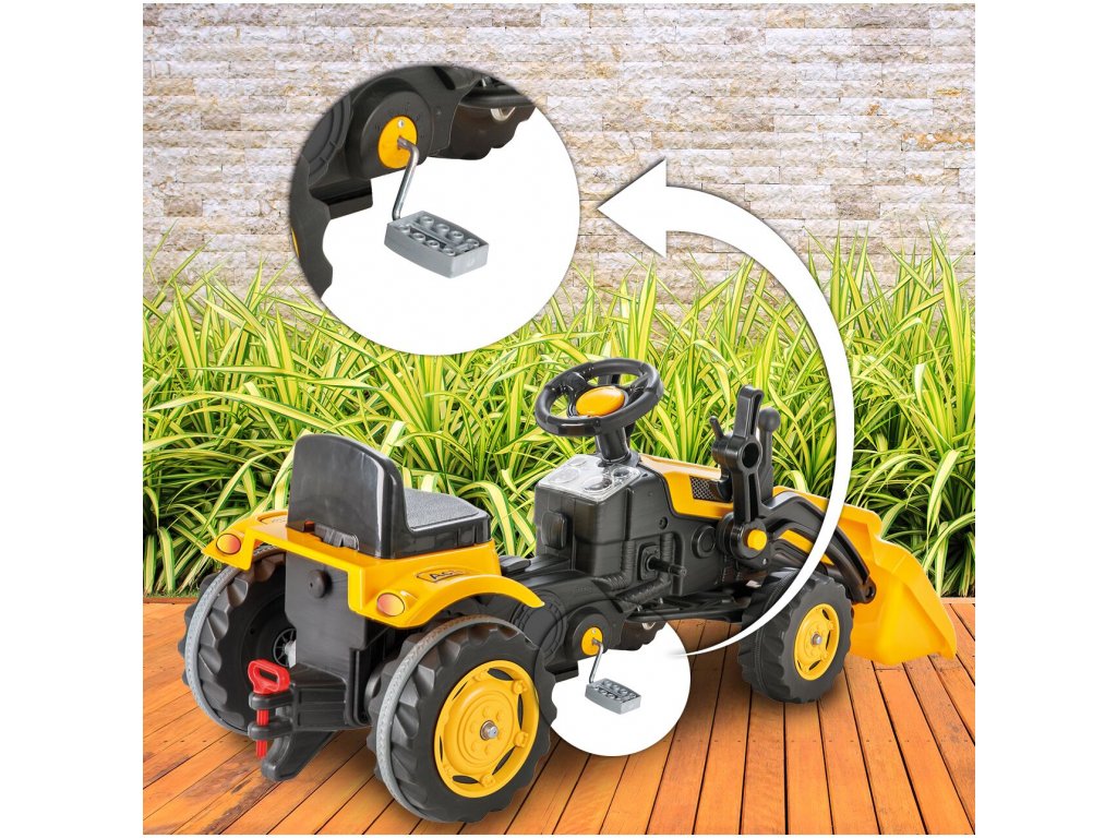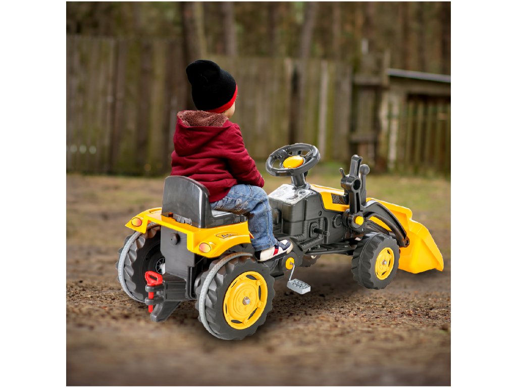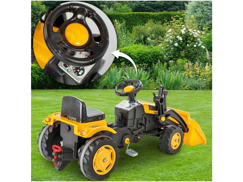 Pótkocsis pedálos gyerektraktor 3 éves kortól 30 kg súlyú gyermekek számára készült. A hajtást lánc biztosítja. A traktornak forgó első kerekei vannak, amelyeket a kormánykerék vezérel. Kürt is található a kormányban. Az ülés két pozícióban állítható. Műanyagból készült, és nagyon alacsony súly jellemzi.