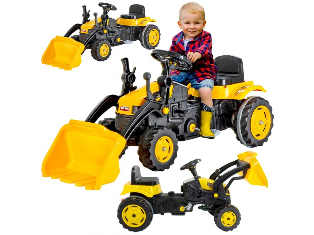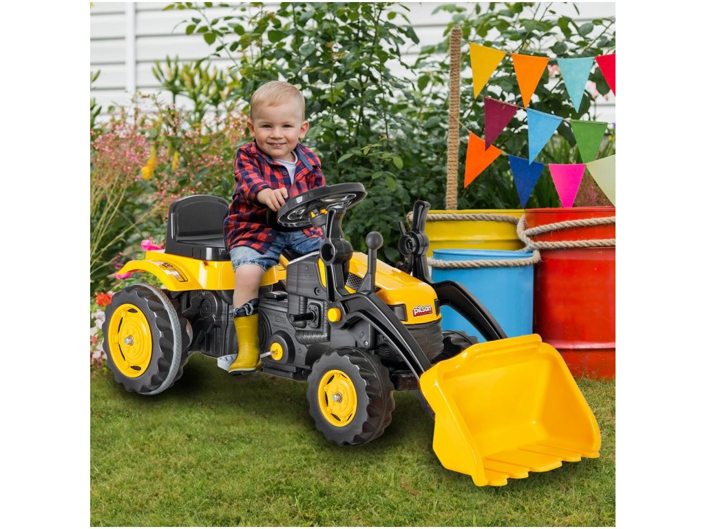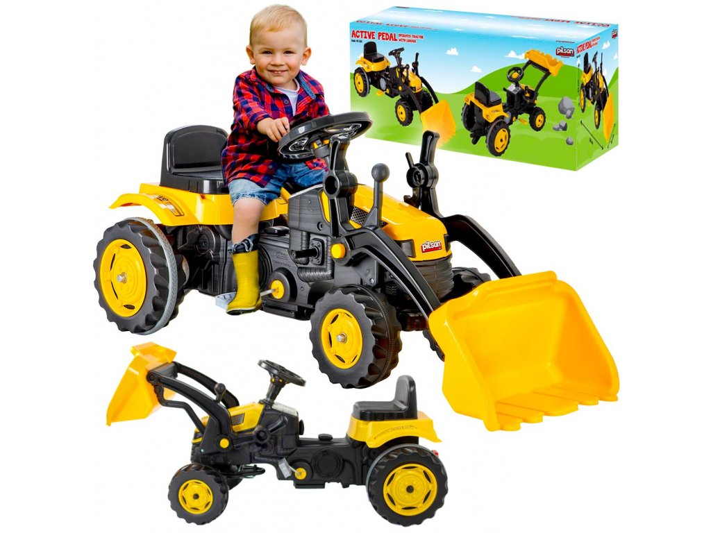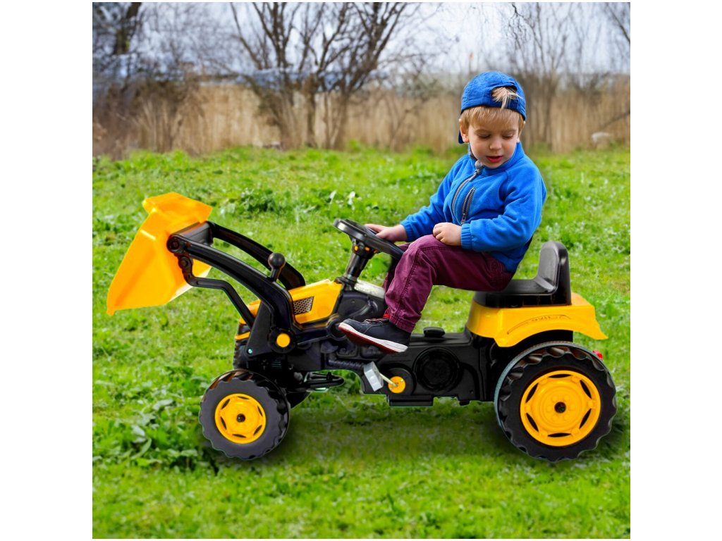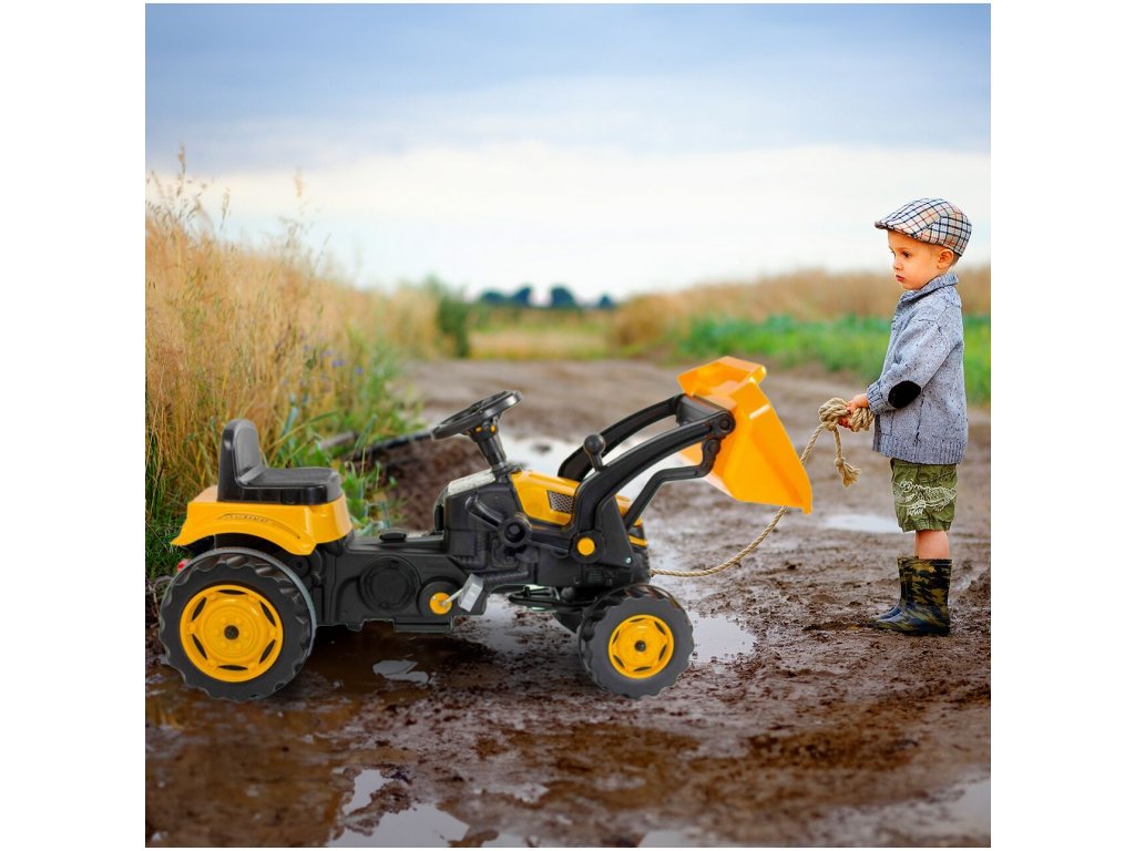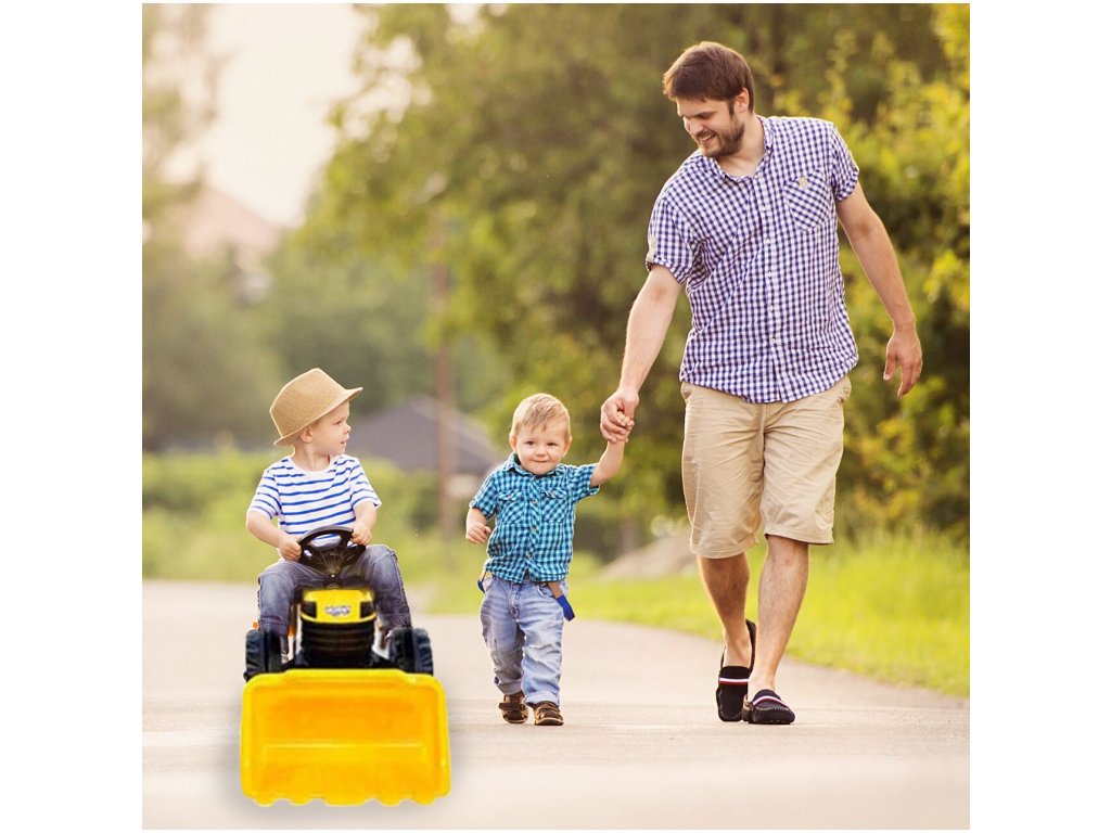 Pótkocsis pedálos gyerektraktor 3 éves kortól 30 kg súlyú gyermekek számára készült. A hajtást lánc biztosítja. A traktornak forgó első kerekei vannak, amelyeket a kormánykerék vezérel. Kürt is található a kormányban. Az ülés két pozícióban állítható. Műanyagból készült, és nagyon alacsony súly jellemzi.