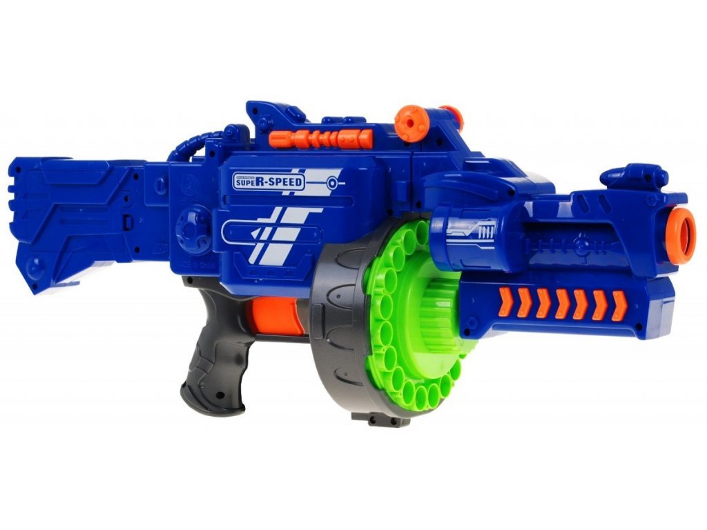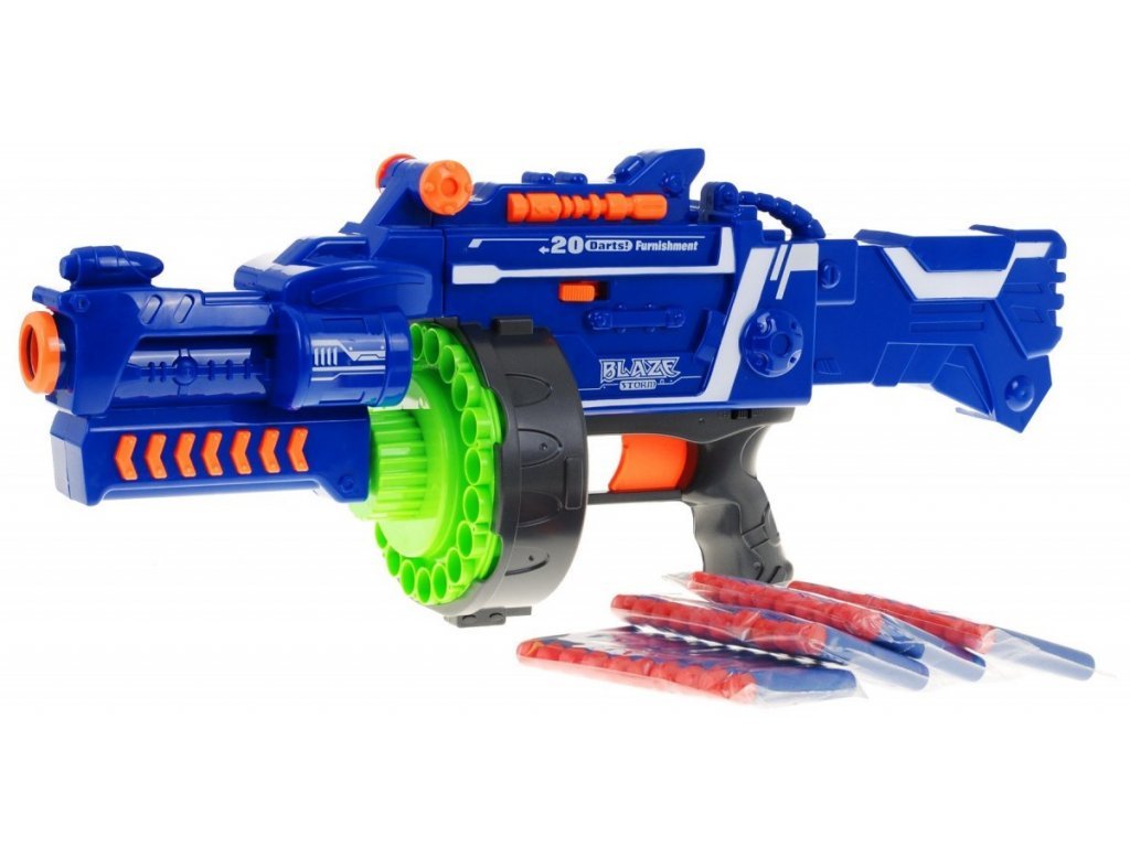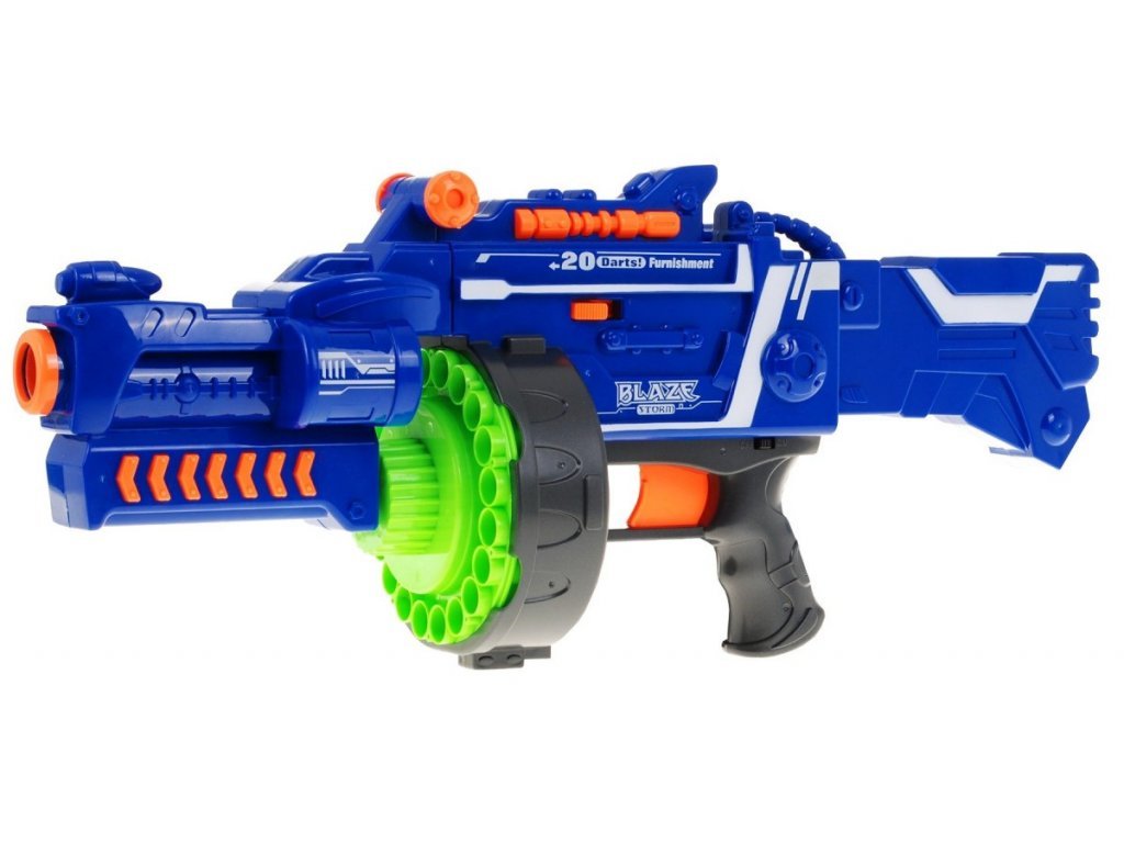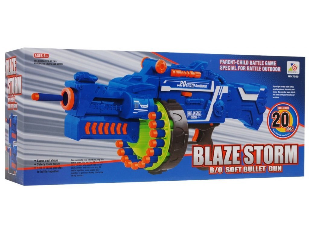 Gyors és pontos, teljesen félautomata Blaze Storm gépfegyver gyermekeknek, ami 20 habtölténnyel van feltöltve. A töltények puhák és tompák, ezért nem áll fenn a sérülés veszélye. A gépfegyvert elölről lehet megtölteni, és másodpercenként 3 lövedéket is kilő, akár 10 m távolságra! A Blaze Storm gépfegyver praktikus, könnyű és tartós. Ez nagyszerű szórakozás a fiúk számára, és elhiheti, hogy az apukák is szívesen fognak játszani ezzel a gépfegyverrel.