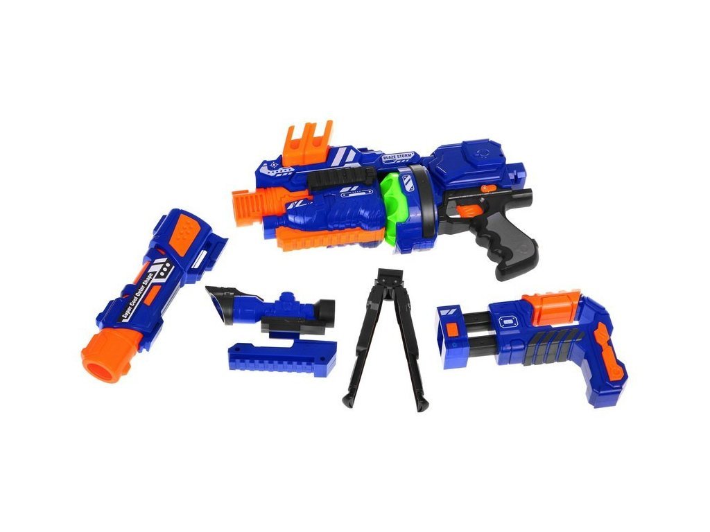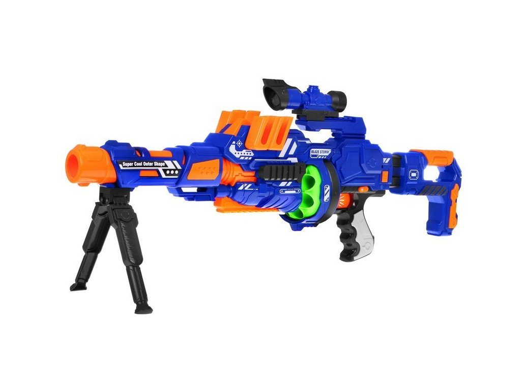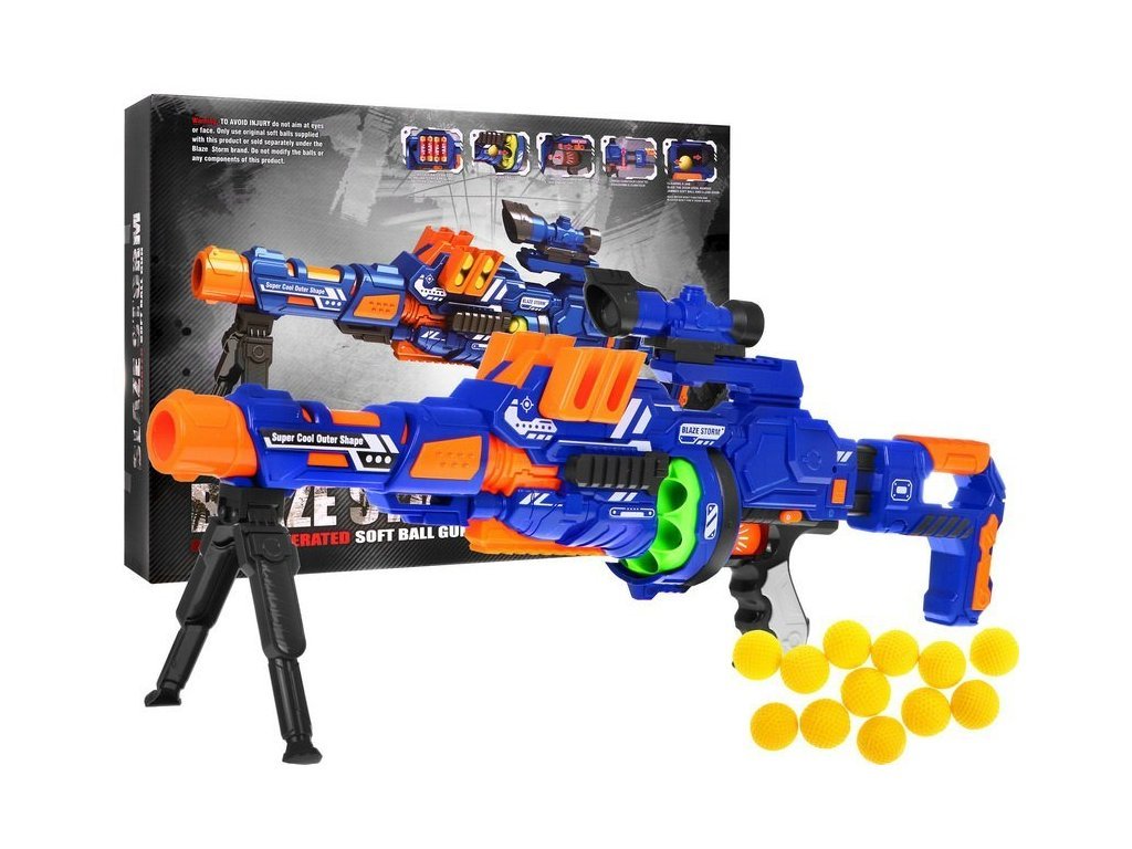 A nagy Blaze Storm gyermek gépfegyver minden fiú álma. Ezt a precíz, félautomata gépfegyvert állvánnyal és a távcsővel, puha golyókkal kell megtölteni, ami azt jelenti, hogy ezzel a játékkal teljesen biztonságos játszani, és nem áll fenn a gyermek sérülésének veszélye. A ravasz egyetlen megnyomásával kilő egy golyót, lenyomva tartás esetében sorozatot lő ki.