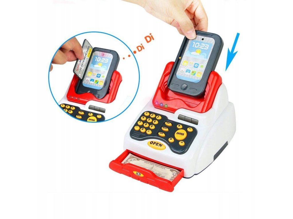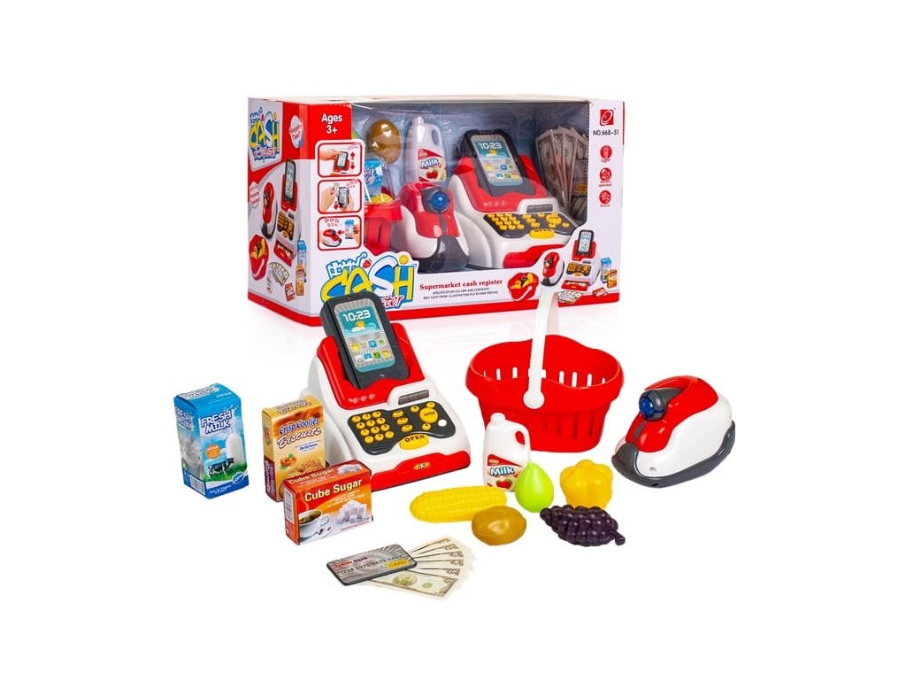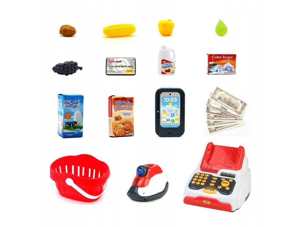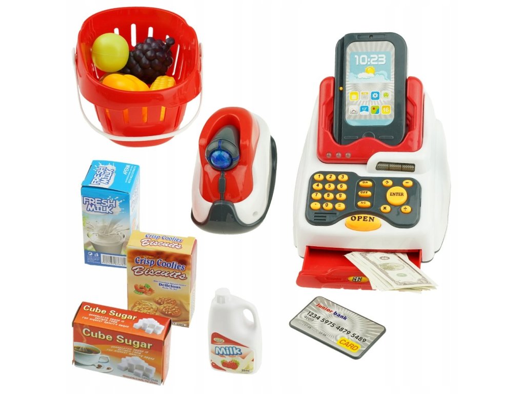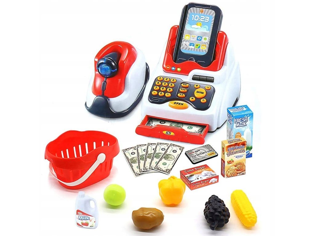 A gyermekek modern elektronikus pénztárgép igazi eladóvá varázsolja gyermekét. Hanggal és fényekkel ellátott hordozható fizetési terminállal van felszerelve. Az alsó részben egy kihúzható rekesz található a bankjegyek és érmék számára, melyek szintén a csomag részét képezik. Az áru a funkcionális szkenner segítségével szkennelhető, a gomb megnyomására a lámpa kigyullad és jellegzetes sípoló hang hallható. A csomag tartalmaz egy bevásárlókosarat és ételutánzatokat is. A játék 36 hónapos kortól ajánlott.