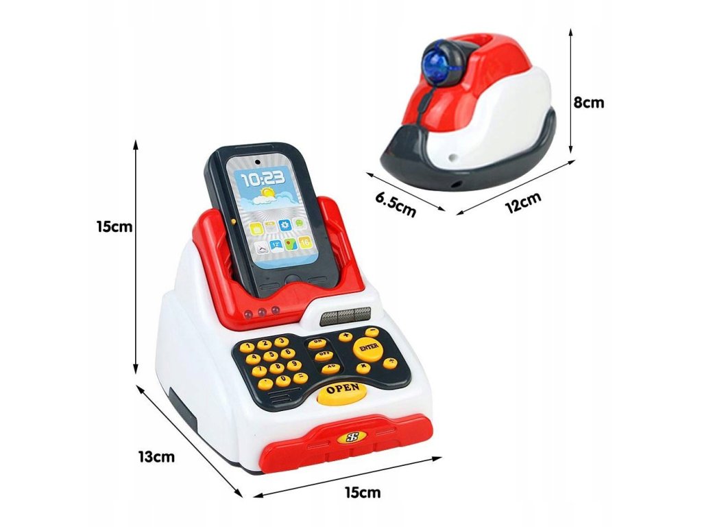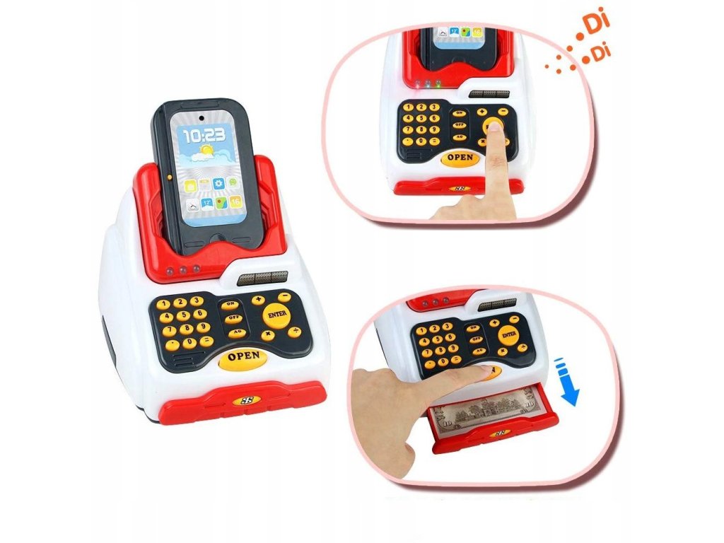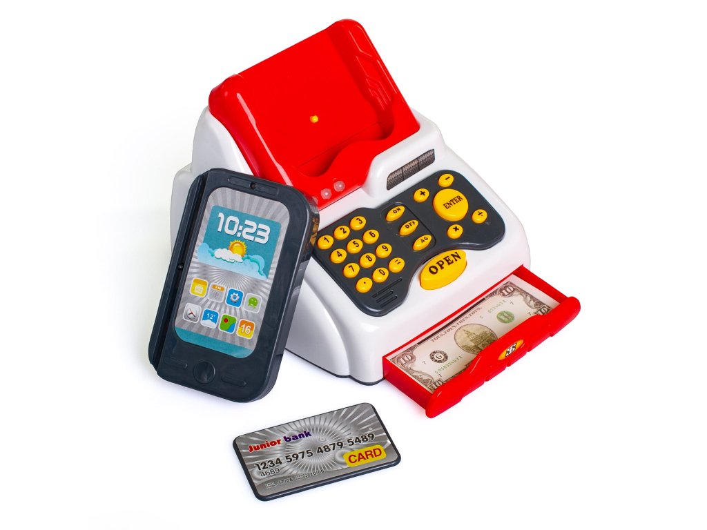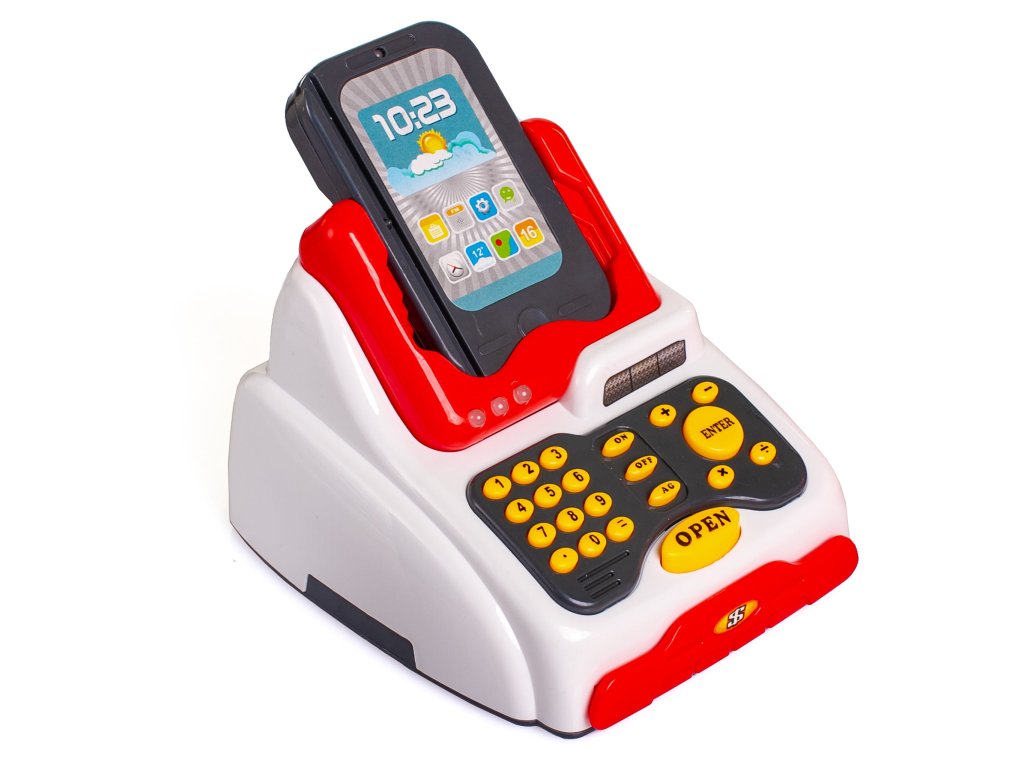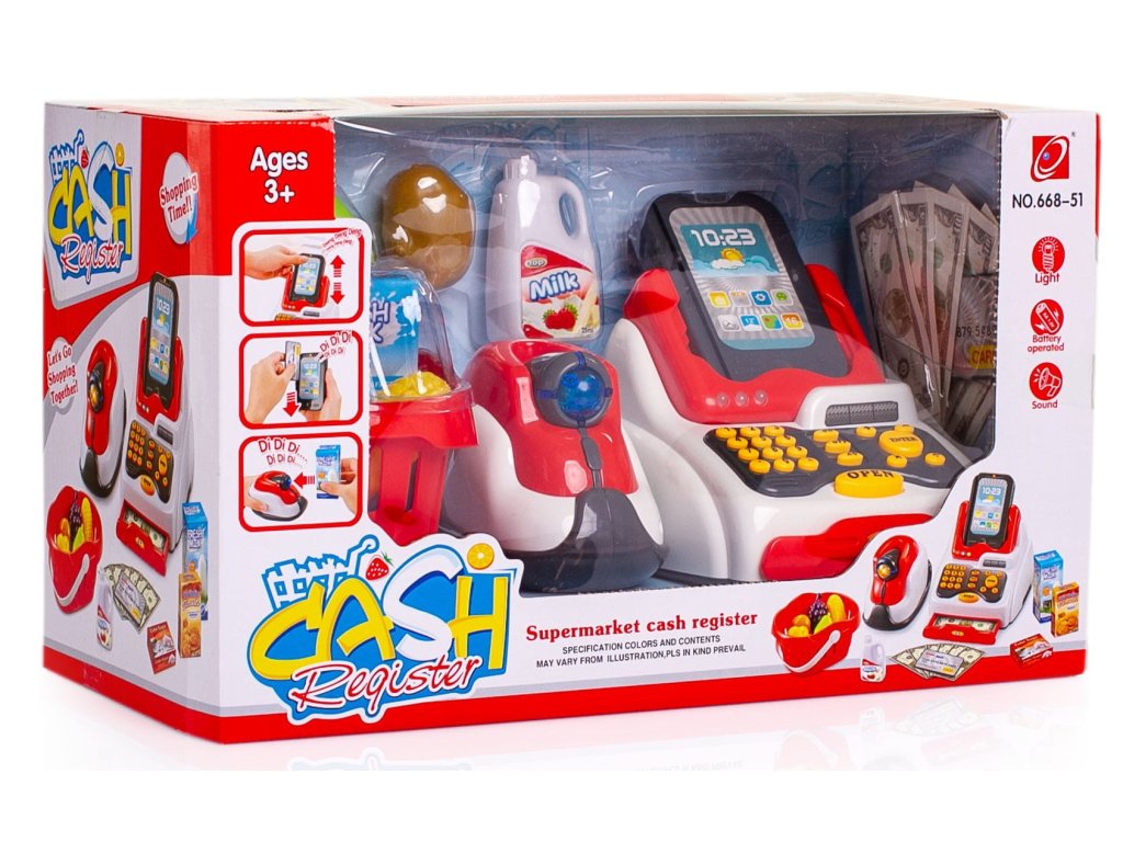 A gyermekek modern elektronikus pénztárgép igazi eladóvá varázsolja gyermekét. Hanggal és fényekkel ellátott hordozható fizetési terminállal van felszerelve. Az alsó részben egy kihúzható rekesz található a bankjegyek és érmék számára, melyek szintén a csomag részét képezik. Az áru a funkcionális szkenner segítségével szkennelhető, a gomb megnyomására a lámpa kigyullad és jellegzetes sípoló hang hallható. A csomag tartalmaz egy bevásárlókosarat és ételutánzatokat is. A játék 36 hónapos kortól ajánlott.
