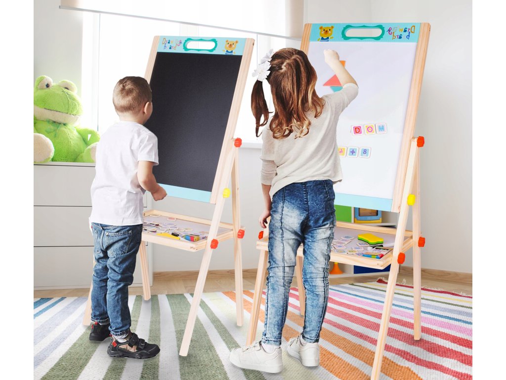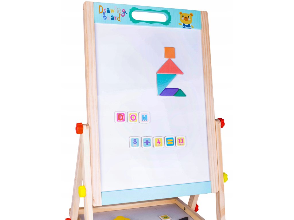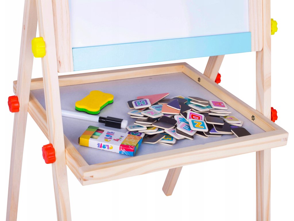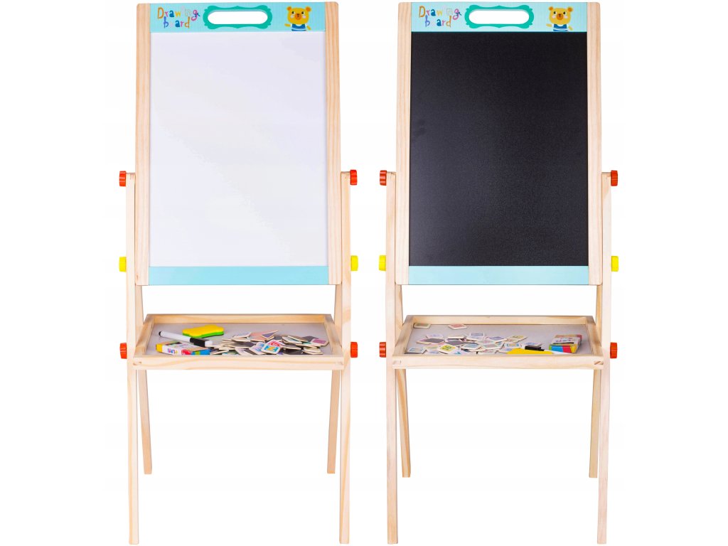 Double Board kétoldalú rajztábla egy kiváló játék a rajzolás és írás tanulása közben. A tábla egyik oldala krétával való írásra szolgál, a másik mágneses, filctollal lehet rá írni. A tábla alján egy tároló polc található. A készlet részét képezi a 4 darab kréta, filctoll, szivacs és a mágneskék különféle jellel. A táblát könnyen és egyszerűen össze lehet rakni, így kis helyen is elfér. Ez a játék 3 éves kortól ajánlott.