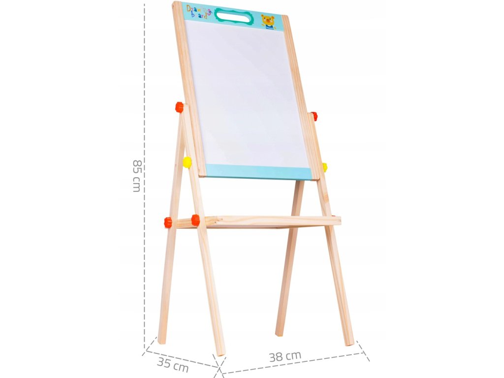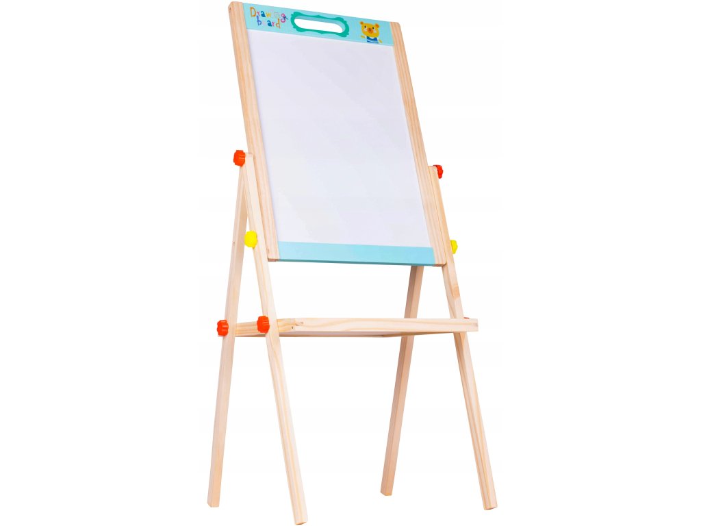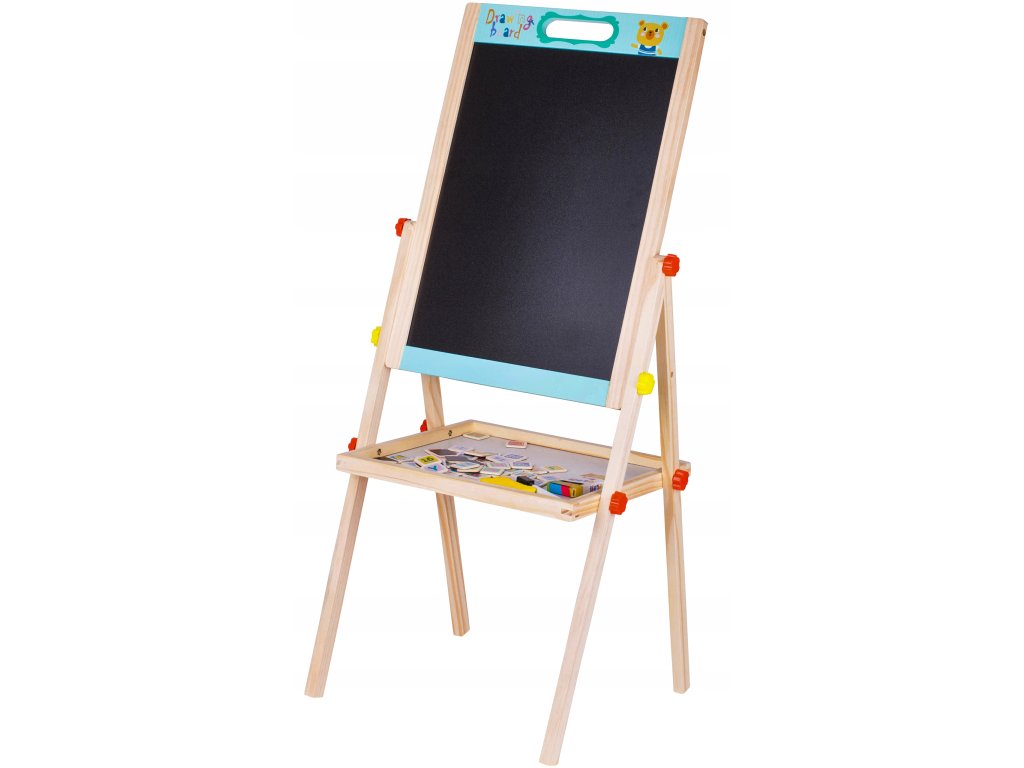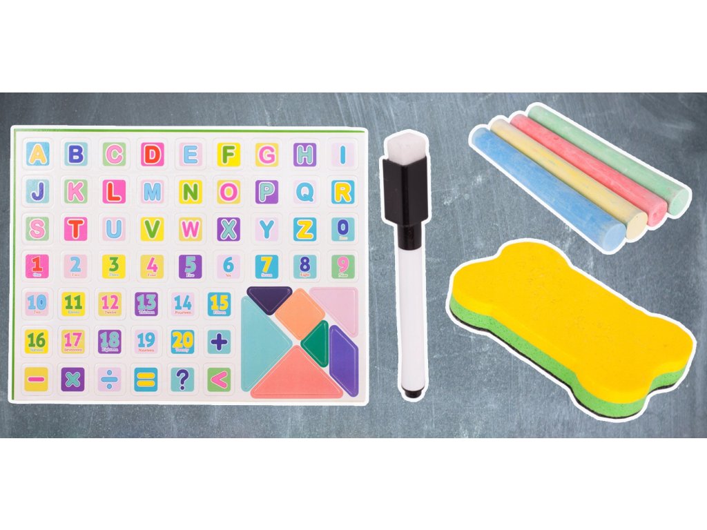 Double Board kétoldalú rajztábla egy kiváló játék a rajzolás és írás tanulása közben. A tábla egyik oldala krétával való írásra szolgál, a másik mágneses, filctollal lehet rá írni. A tábla alján egy tároló polc található. A készlet részét képezi a 4 darab kréta, filctoll, szivacs és a mágneskék különféle jellel. A táblát könnyen és egyszerűen össze lehet rakni, így kis helyen is elfér. Ez a játék 3 éves kortól ajánlott.