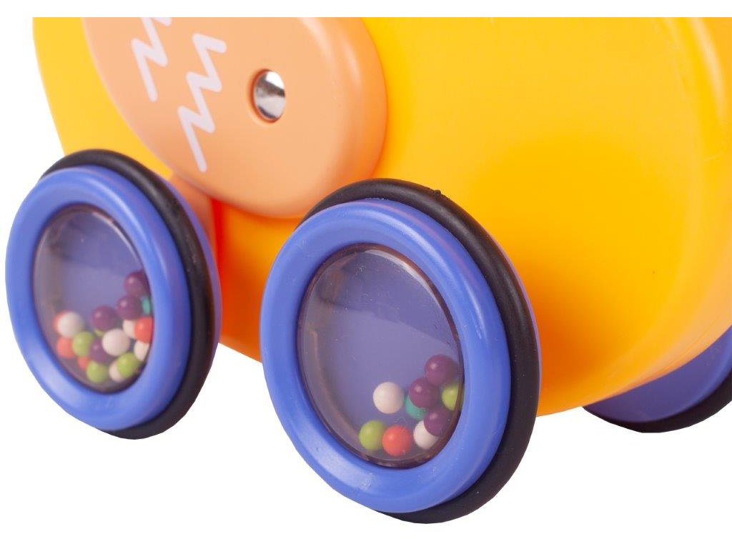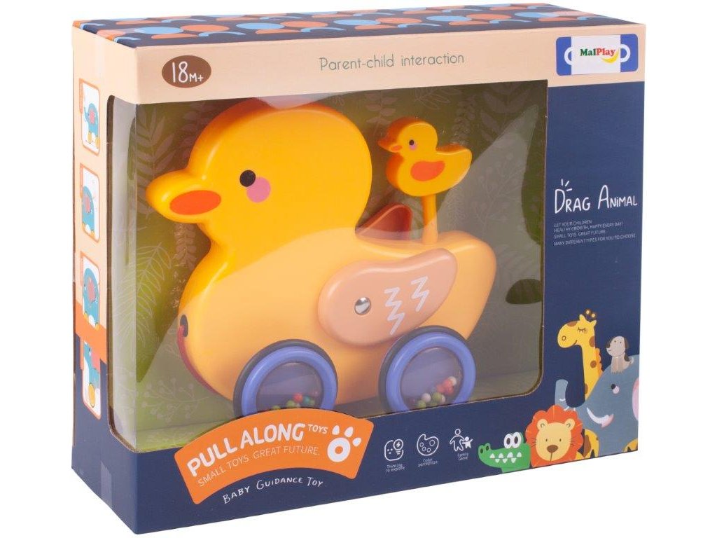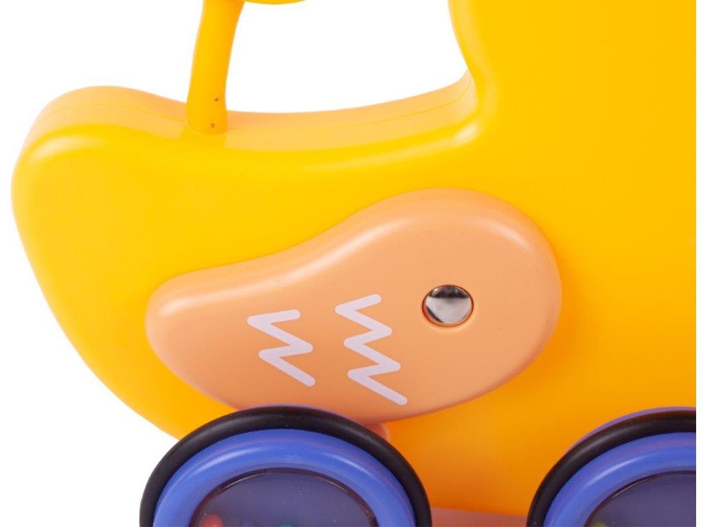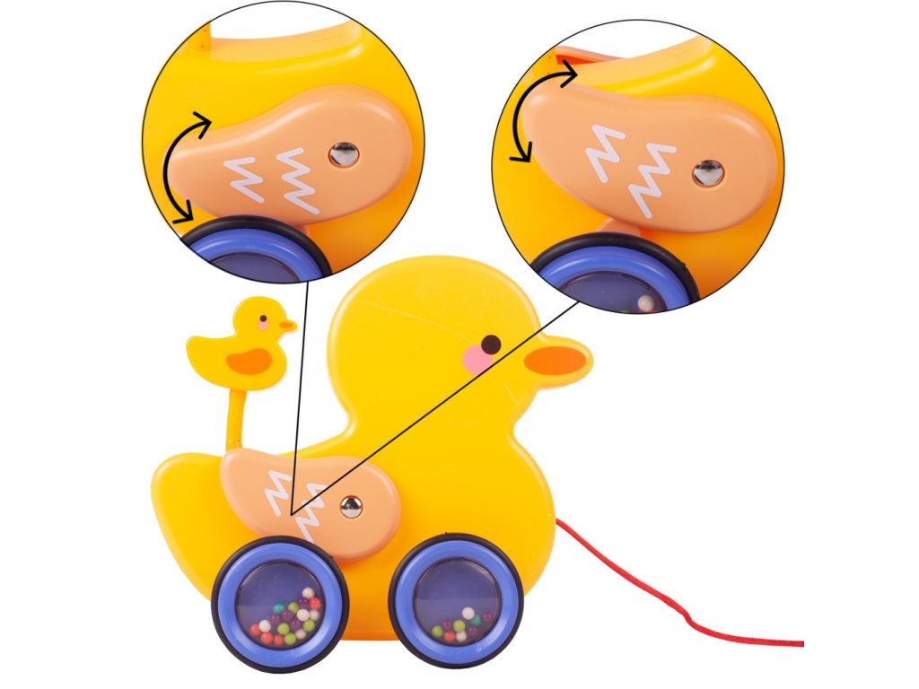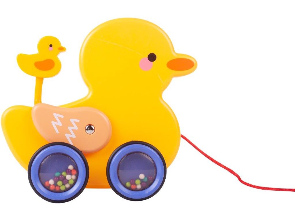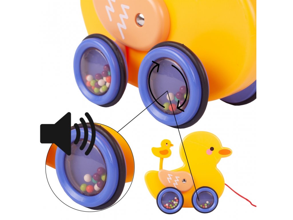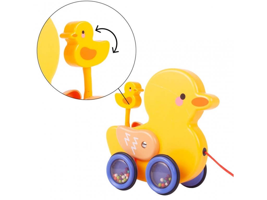 Duck Toodle zsinóron húzható fa kacsa 18 hónapos kortól ajánlott. Fejleszti a koordinációt, és a mozgást, javítja az egyensúlyt. A kerekek gumival vannak bevonva, így nem csúsznak a padlón, a belsejében golyócskák vannak, csörgőként szolgálnak, menetközben csörögnek. A zsinór hossza 75 cm.