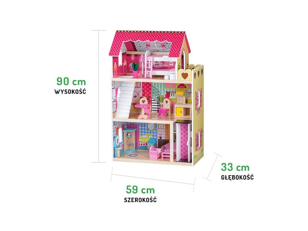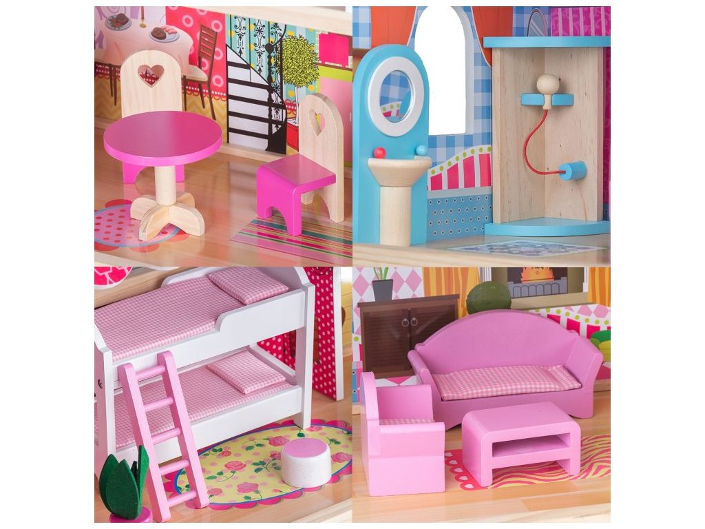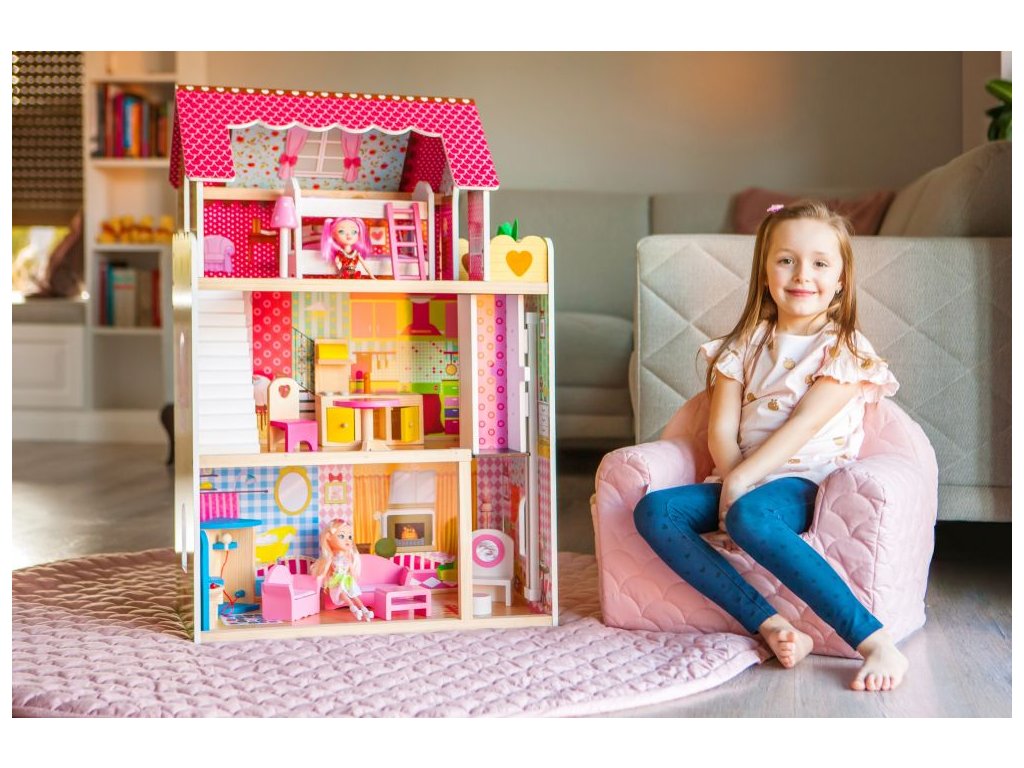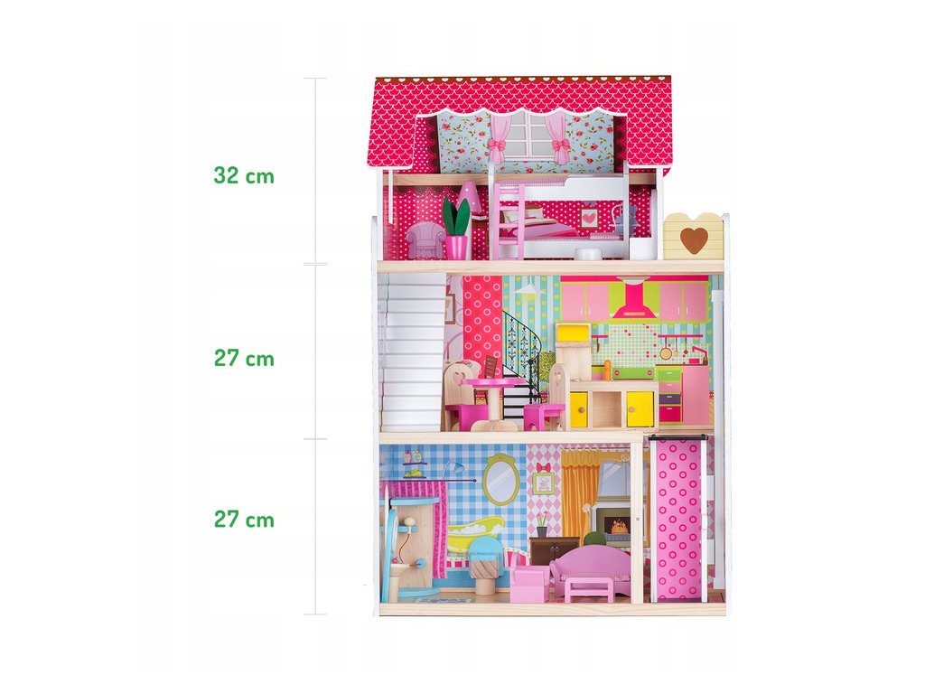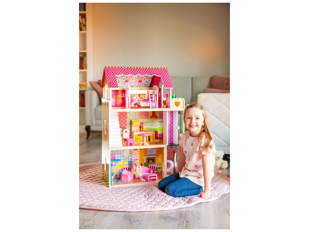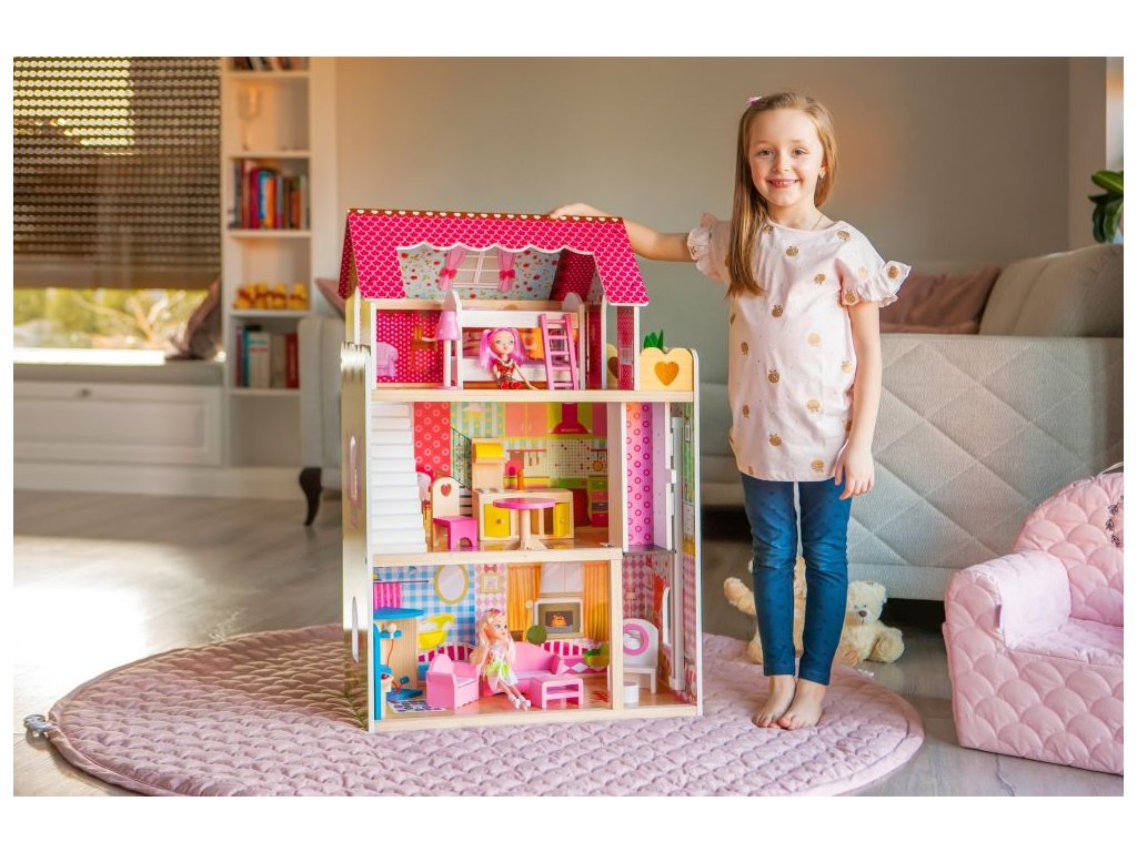 MÁLNA JÁTÉK BABAHÁZ 3 különálló szinttel rendelkezik, amelyekben összesen 5 szoba található - minden tökéletesen utánozza a valódi házat. Minden szoba más stílusban készült el, a berendezés és a bútorok a szoba jellegéhez és rendeltetéséhez igazodtak. A készlet tartalmaz egy 17 darab fából készült bútort, amely korlátozás nélkül mozgatható. Minden bútordarab kézzel készült, nagy figyelmet fordítva a részletekre és a legmagasabb színvonalú kivitelezésre, gondot fordítottak az éles élek eltávolítására is, amelyek elengedhetetlenek a gyermek biztonsága érdekében. A MÁLNA játék babaház kétségtelenül a legjobb ajándék, amelyet gyermekének adhat! Minden lány ilyen házról álmodik! A Málna Rezidencia nemcsak a gyermekszobában, de a nappaliban is jól fog mutatni, ami megörvendezteti a háztartás minden tagját. Nem kell aggódnia a ház összerakása miatt - egy világos útmutató képekkel és az összes elem számozásával lehetővé teszi a ház gyors és hatékony összerakását. Hogy ne kelljen aggódnia a választás miatt, a MÁLNA házhoz 2 gyönyörű nagy babát is kap, amelyek tökéletesen illeszkednek a ház környezetébe és minden szórakozást vonzóbbá tesznek.
