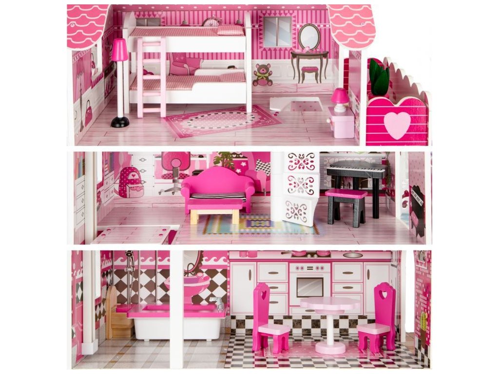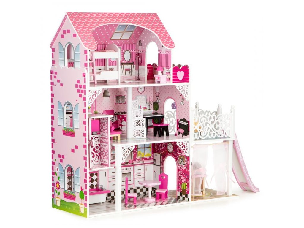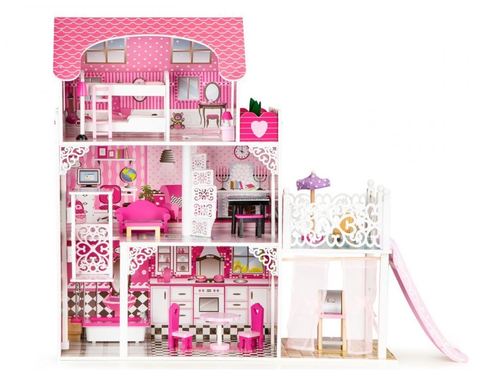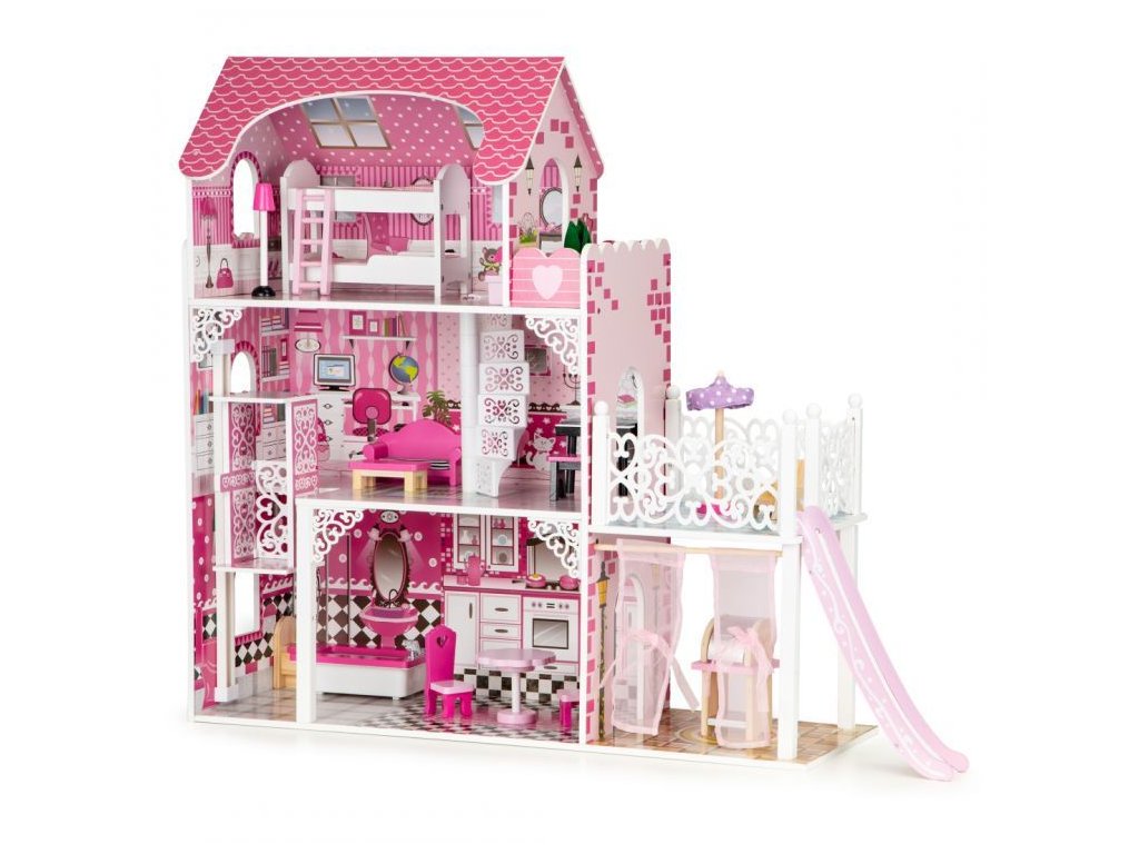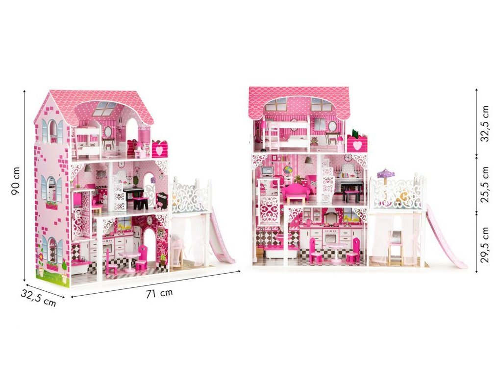 A Jersey játék babaháznak csúszdával 3 önálló szintje van, amelyekben összesen 5 szoba található, nagy terasz csúszdával, hely grillezéshez- minden tökéletesen egy igazi házat utánoz. Minden szoba más stílusban készült el, a berendezés és a bútorok a szoba jellegéhez és rendeltetéséhez igazodtak. A készlet tartalmaz egy 16 darab fából készült bútort, amelyek korlátozás nélkül mozgatható. Minden bútordarab kézzel készült, nagy figyelmet fordítva a részletekre és a legmagasabb színvonalú kivitelezésre, gondot fordítottak az éles élek eltávolítására is, amelyek elengedhetetlenek a gyermek biztonsága érdekében. A Jersey játék babaház kétségtelenül a legjobb ajándék, amelyet gyermekének adhat! Minden lány ilyen házról álmodik! A játék babaház nemcsak a gyermekszobában, de a nappaliban is jól fog mutatni, ami megörvendezteti a háztartás minden tagját. Nem kell aggódnia a ház összerakása miatt - egy világos útmutató képekkel és az összes elem számozásával lehetővé teszi a babaház gyors és hatékony összerakását .