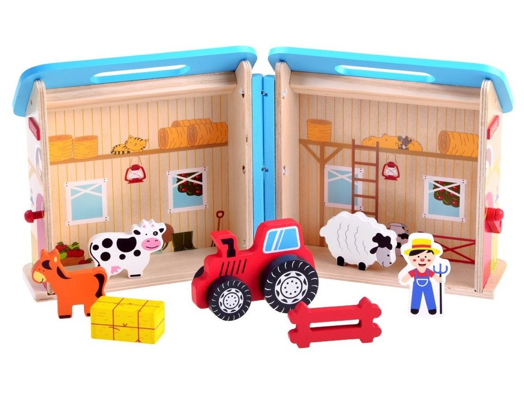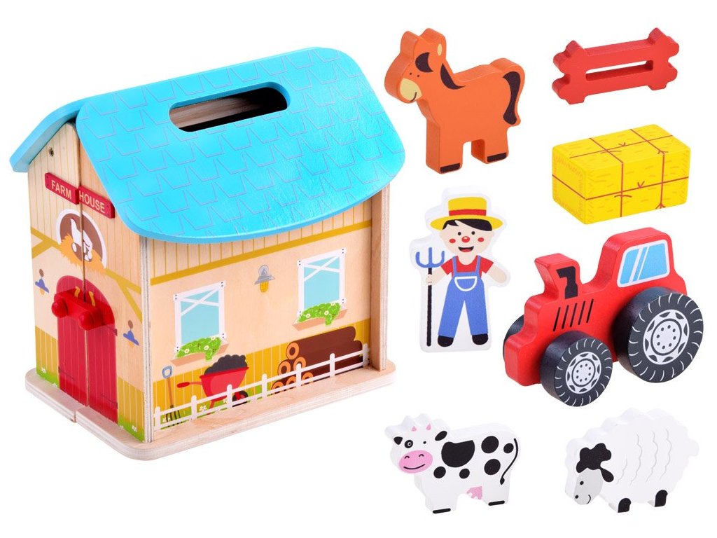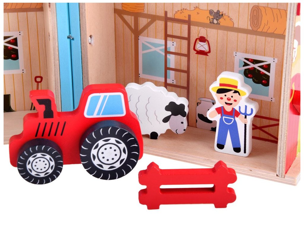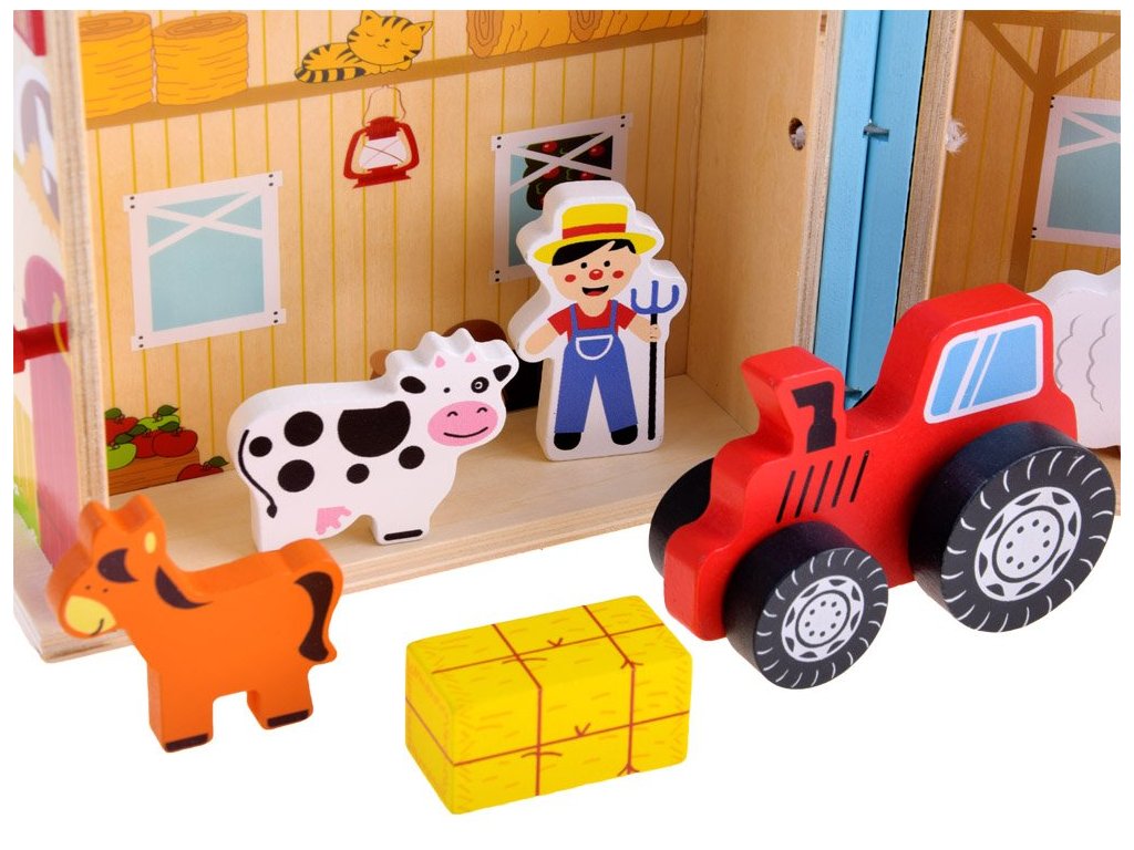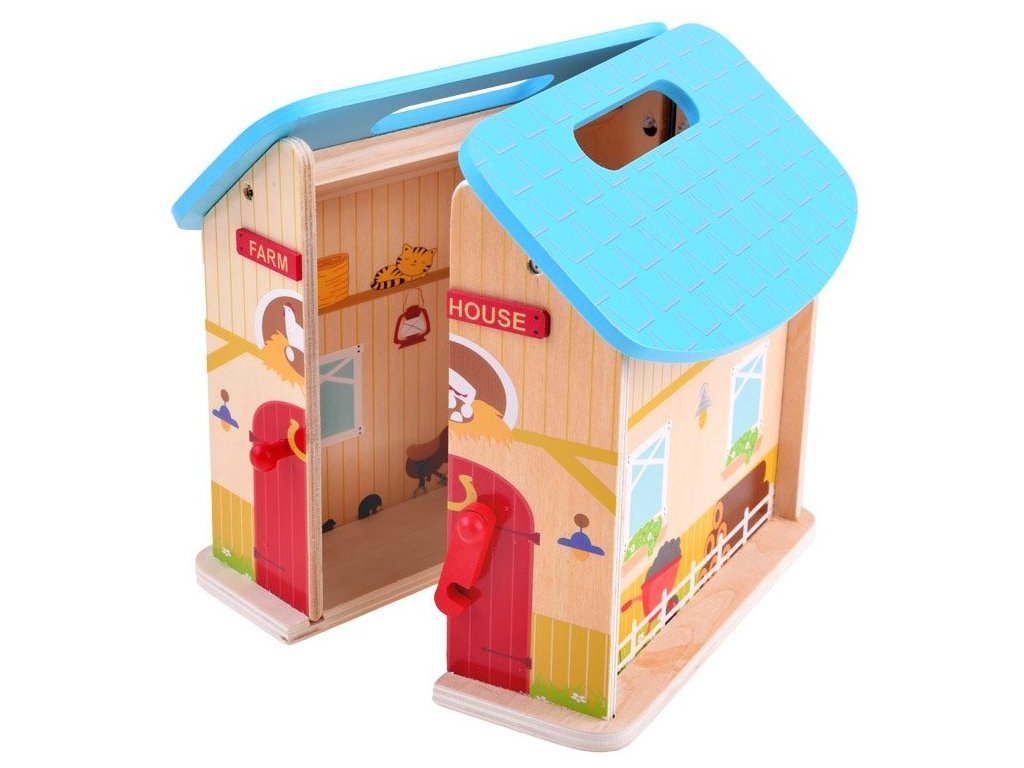 A Farm House fából készült összecsukható ház állatokkal lehetővé teszi a gyermekek számára, hogy szórakozzanak, mint egy igazi farmon. A pajtaház szétszerelhető, és állatokat, traktort, gazdát, kerítést és még szalmabálát is tartalmaz. Kicsi méretének és a bezárás lehetőségének köszönhetően a ház ideális játék, amelyet a gyermek magával vihet, bárhova akarja. A játék 3 éves kortól ajánlott.