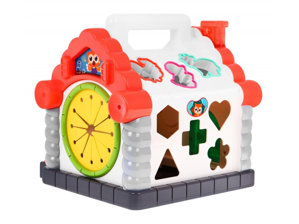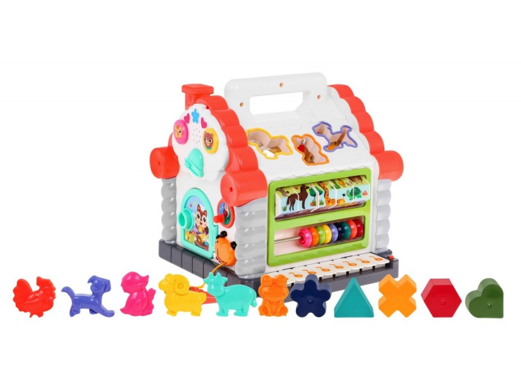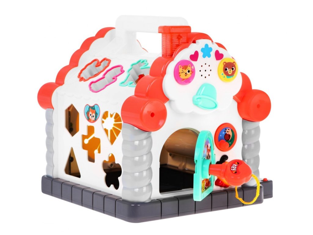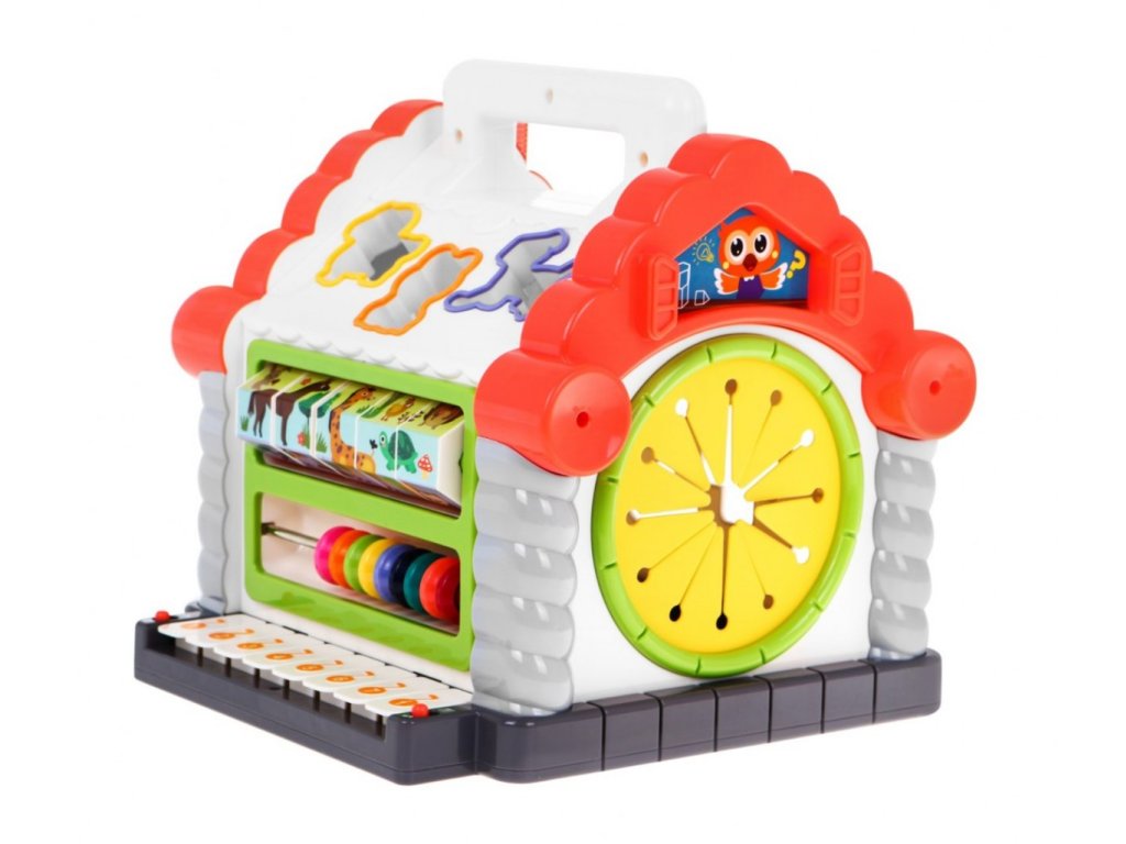 Huile Toys interaktív multifunkciós Ház hangokkal és fényekkel ideális játék a legkisebb gyermekek számára. Lehetővé teszi a gyermek számára az érintés, a látás, a hallás, a matematika és a logikus gondolkodás fejlesztését. A ház mindkét oldala más-más szórakozást nyújt: abakusz számoló, forgó henger számokkal és egyszerű matematikai feladatokkal, kerek nyílások a kockák behelyezéséhez és kihúzásához, nyitható ajtó kulccsal egy feltekerhető zsinórral. Alul egy zongora hangokat és dallamokat ad ki. Állatok alakjában nyílások vannak a tetőn, ha a gyermek a megfelelő állatot bedobja a nyílásba, akkor ugyanaz az állat hangja megszólal és a kémény világít. A játék gyermekek számára készült 18 hónapos kortól.