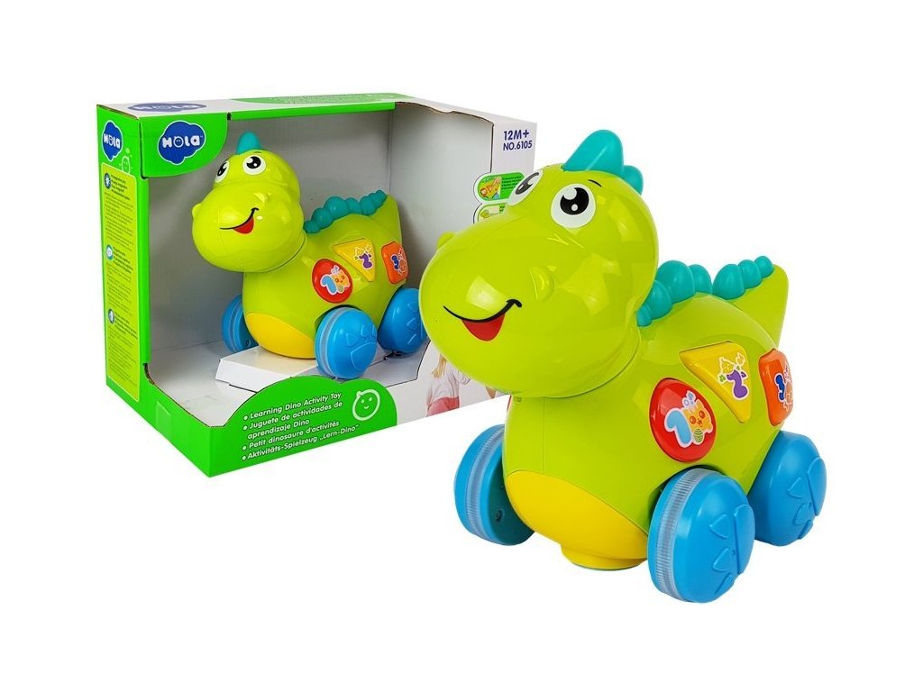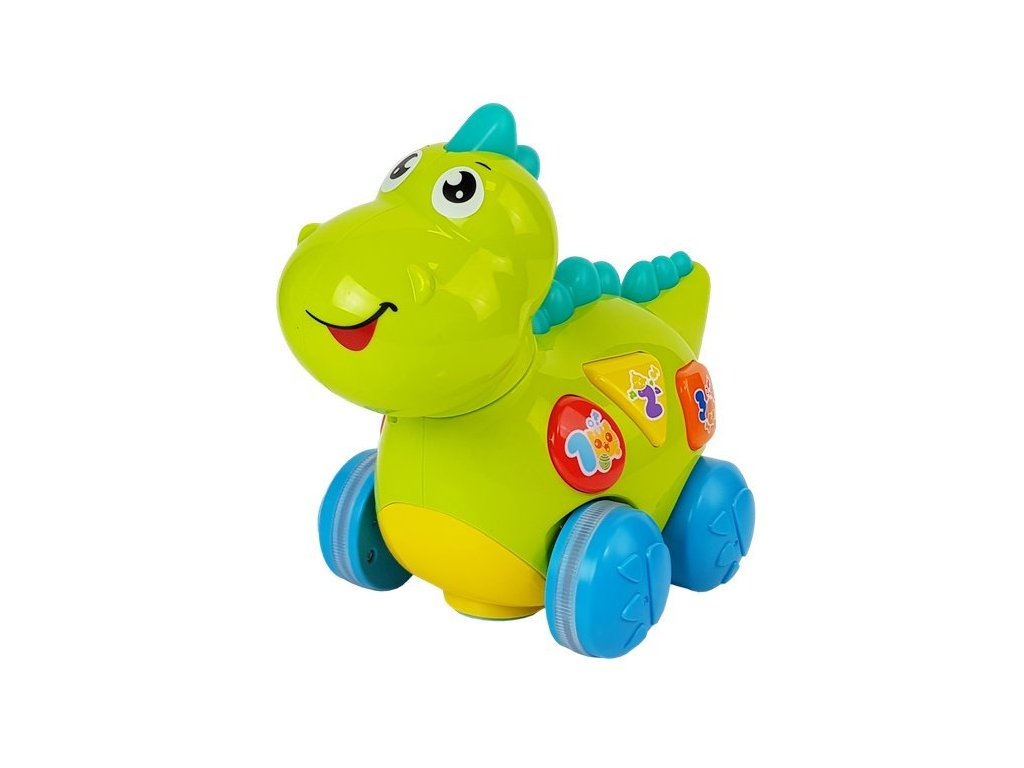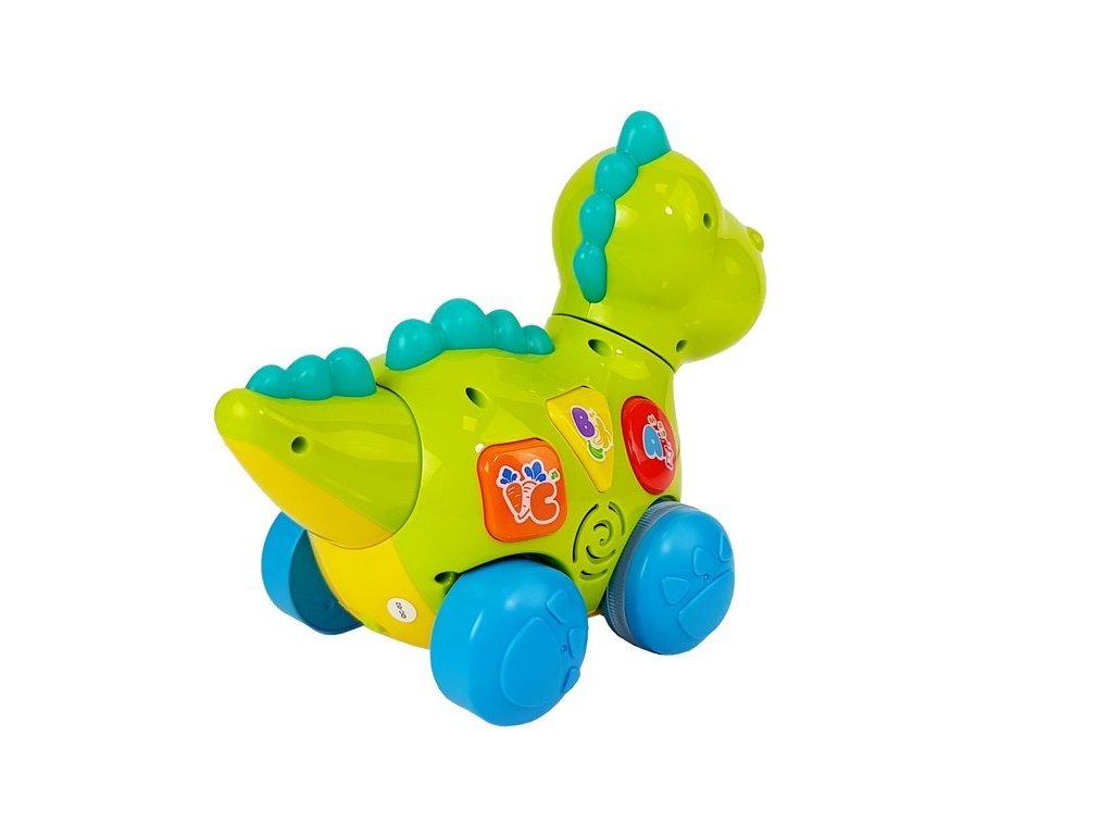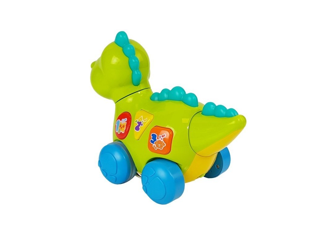 Huile Toys interaktív Dinoszaurusz hangokkal és fényekkel ideális játék a legfiatalabb gyermekek számára. Lehetővé teszi a gyermek számára az érintés, a látás, a hallás és az angol nyelv fejlesztését, amikora tanítási üzemmódban angolul mondja a betűk, számok és állatok nevét. A dinoszaurusznak két üzemmódja van, amelyekben játszhat vele. Az 1. üzemmódban áll vagy saját kezűleg irányíthatja, a második üzemmódban vidám dallamokkal együtt mozog és csak akadályba ütközve változtatja meg az irányt. Haladás közben a dinoszaurusz mozgatja a farkát és a fejét. A játék gyermekek számára készült 12 hónapos kortól.