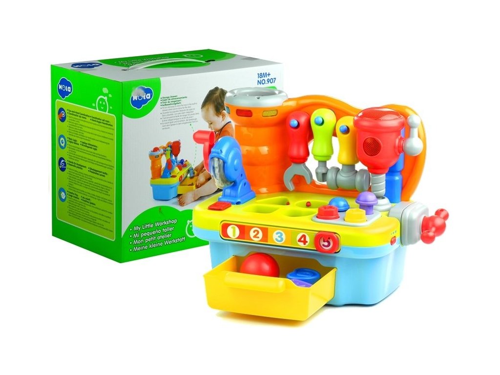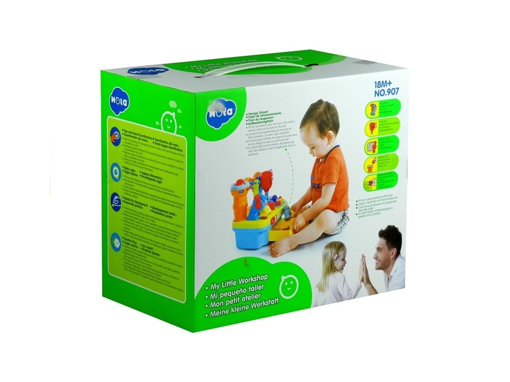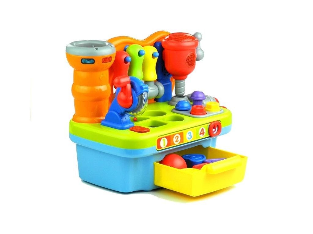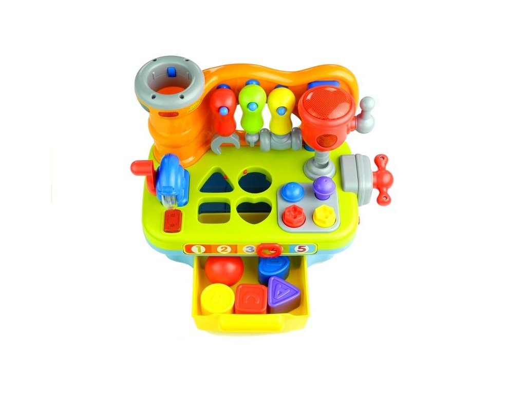 Huile Toys multifunkciós munkaasztal ideális játék a legkisebb gyermekek számára. A gyermek "megjavíthatja" rajta kedvenc játékait. Az asztal bedobó nyílásokkal van felszerelve, amelyeken keresztül a színes kockákat lehet bedobni. Amikor egy speciális nyílásba dobja be a labdát, a hang elindul. Az asztal támogatja az angol nyelv oktatását a munka folytatására vonatkozó utasítások kiadásakor. Szórakoztató a szegek mozgatása is, amikor az egyik betolása megmutatja a többit. Az asztal ideális játék a kézi készségek gyakorlásához, a számoláshoz, a színek és formák felismeréséhez. A játék gyermekek számára készült 18 hónapos kortól.