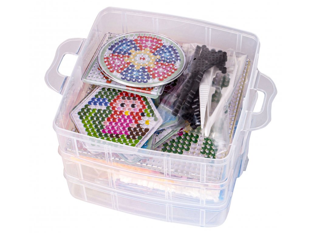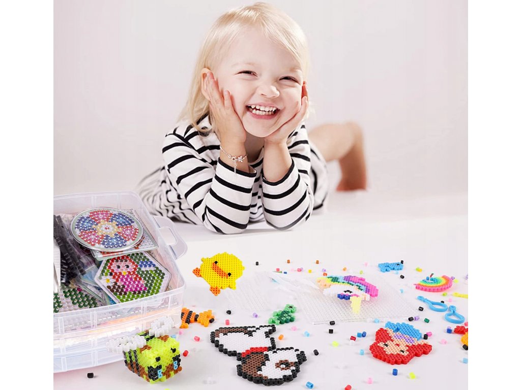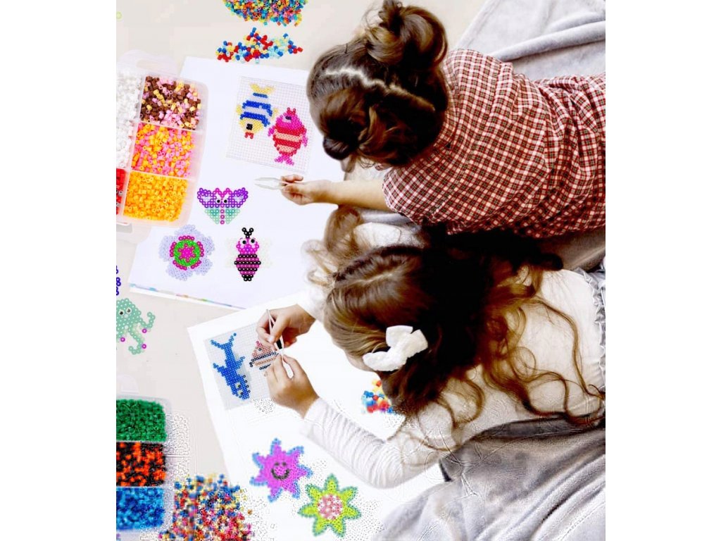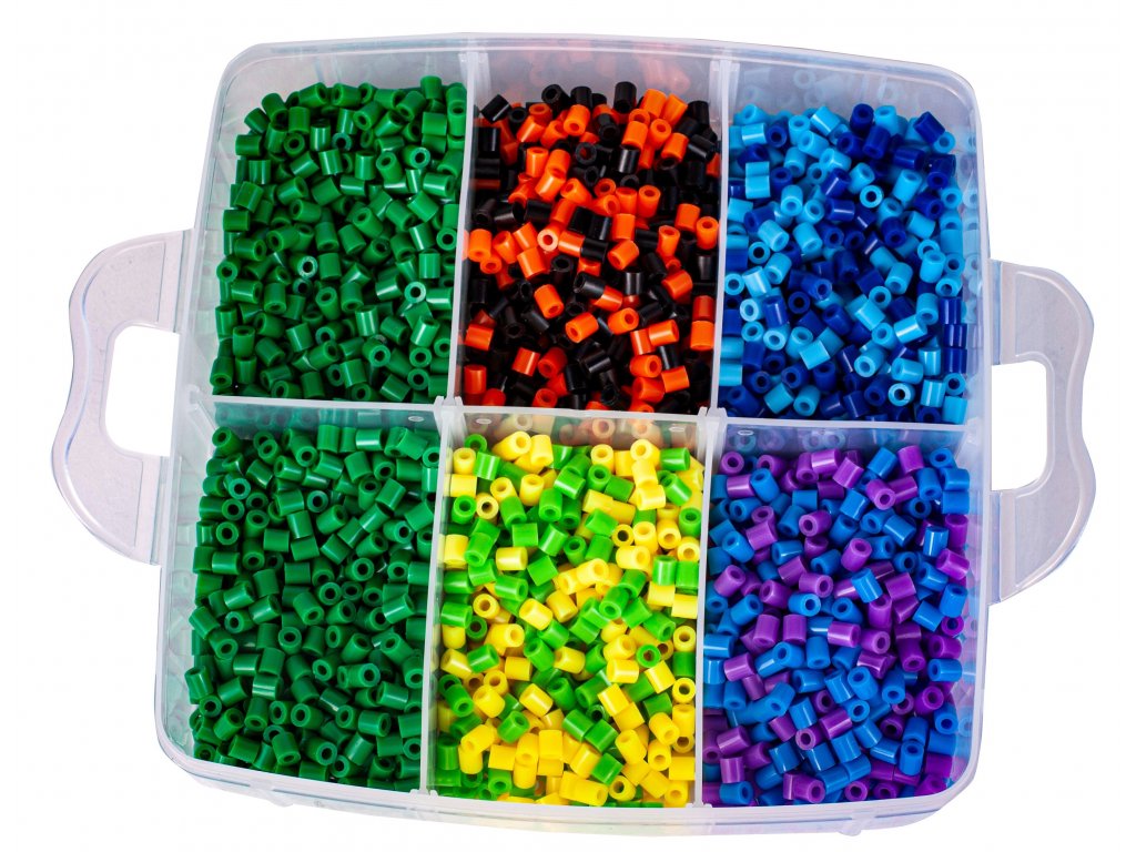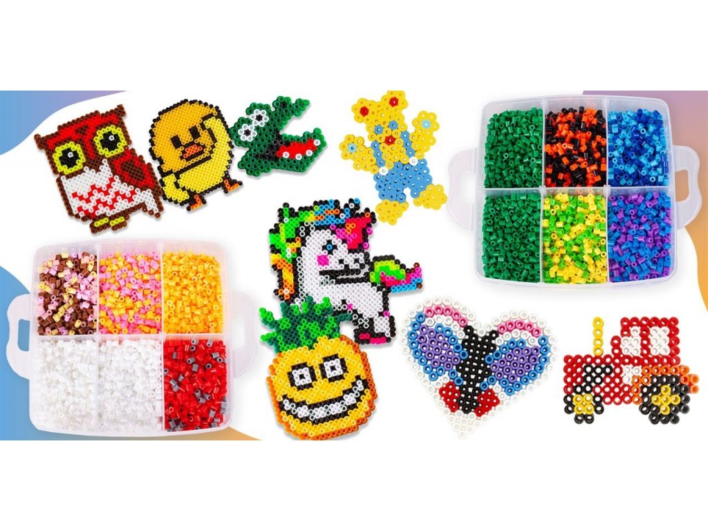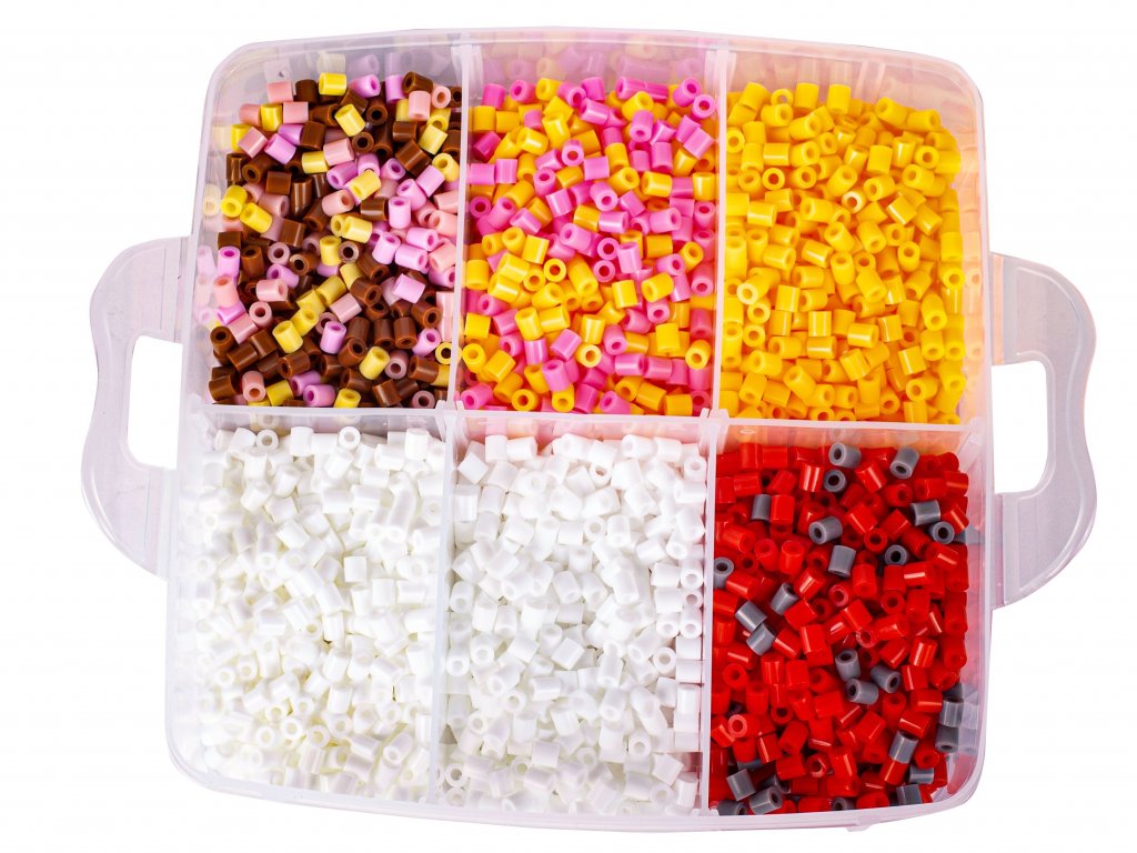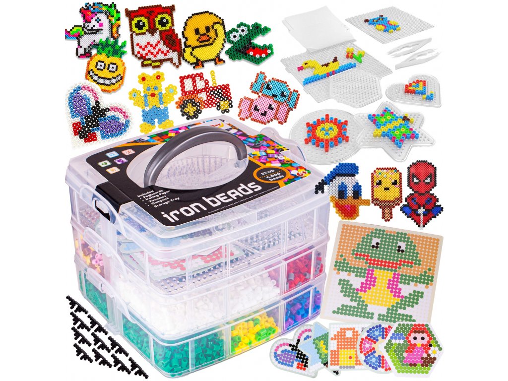 Iron Beads színes vasalható gyöngyökből álló készlet fejleszti a gyerekek fantáziáját, ösztönzi a kreativitást és a kézi készségeket. A készlet összesen 6000 gyöngyöt tartalmaz különböző színárnyalatokban. Különféle minták, formák, karkötők, 3D-s karakterek és nyakláncok készíthetők belőlük, amelyeket a mellékelt vasalópapírral vasalunk át. Mindent egy praktikus műanyag vödörben tárolunk, felső fogantyúval. A játék 6 éves kortól alkalmas.