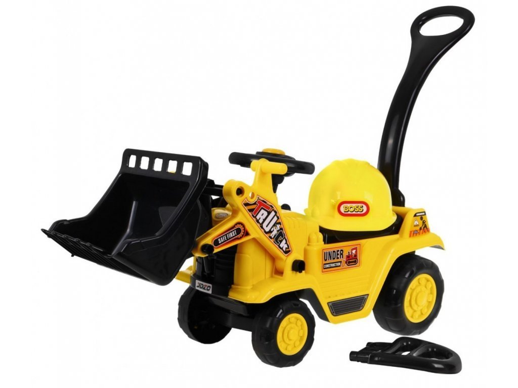 Gyermek lábbal hajtós rakodógép 2 az 1-ben forgatható első kerekekkel és kormánykerékkel sok mókát és szórakozást garantál gyermekének. A rajta eltöltött szórakozás segít fejleszteni a gyermek kézügyességét, a hallás, a látás és a tapintás fejlődését. Kétféleképpen használható, külön rakodógépként vagy vezetőrúddal rendelkező kocsiként. A vezetőrúd és a háttámla könnyen eltávolítható. Az elülső rakodókanál mozgatható. Az ülés alatt praktikus tárolóhely található, amely biliként is használható. A rakodógép hátsó részén található egy kampó a pótkocsi rögzítésére. A csomag tartalmaz egy praktikus védősisakot is. A színes, ragyogó kialakításnak köszönhetően a rakodógépben soha nem fog unatkozni a gyermeke, mindig szórakoztató lesz számára. A jármű minőségi anyagból készült és nagyon stabil. Teljesen biztonságos vele játszani.