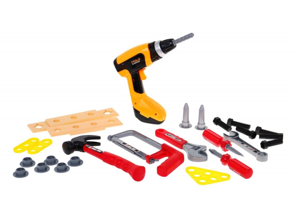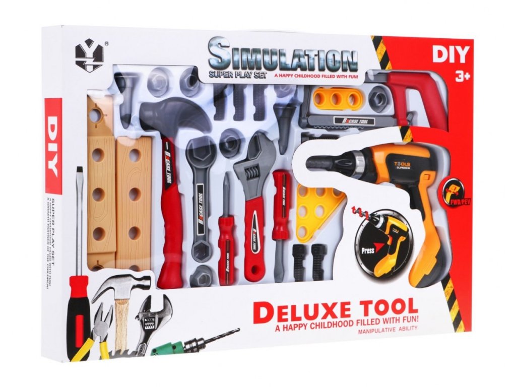Műanyag szerszámkészlet a legkisebb barkácsolóknak Deluxe Tool. A készlet összesen 26 elemet tartalmaz, köztük fűrészt, kalapácsot, villáskulcsot, csavarokat és egyéb alkatrészeket. A készlet tartalmaz egy elemes fúrót is, amely bekapcsoláskor jellegzetes hangot ad ki. A játék gyermekek számára készült 36 hónapos kortól.