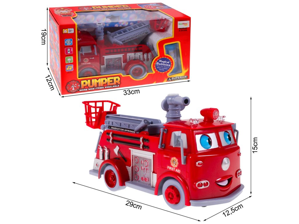 A Bubble Pumper buborékfújóval tűzoltóautó alakjában, végtelen számú buborékot hozhat létre. Forgó vízágyúval rendelkezik, amelyből a szappanoldat beleöntése után buborékok keletkeznek. A tartály a tűzoltóautó tetején található, az öntést megkönnyíti a mellékelt tölcsér. Az tűzoltóautónak egyéb funkciói is vannak, mint például egy kihúzható létra kosárral, villogó fények és egy tűzjelző sziréna hangja. Menet közben az autó kiölti a nyelvét és pislog a szemeivel, amelyek a tűzoltóautó elülső részén találhatók. A játék műanyagból készült, ami gyermekek számára készült 36 hónapos kortól.