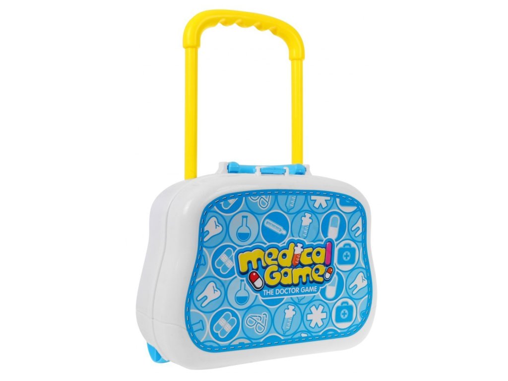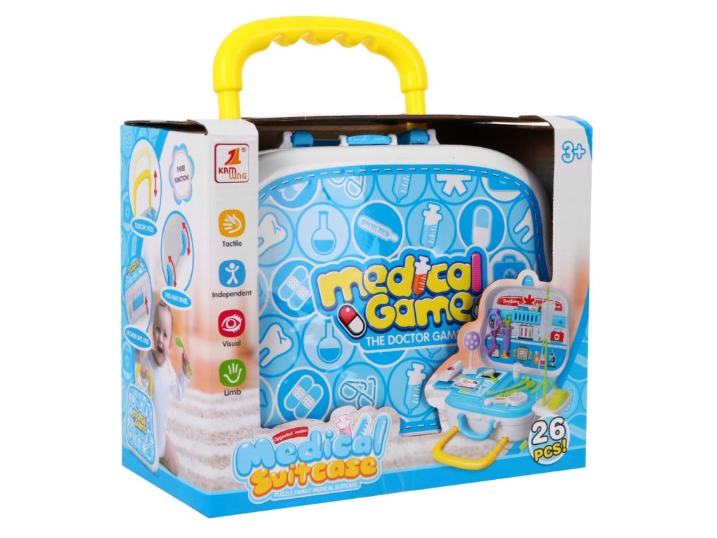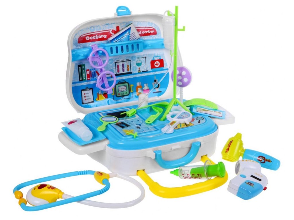 A teljesen felszerelt orvosi koffert Medical Suitcase 36 hónapos gyermekek számára tervezték. Összesen 26 elemmel van felszerelve. Az alap egy kerekes koffer és egy fogantyú a könnyű hordozás érdekében. Belül van egy nagyobb polc a kiegészítők számára és két kisebb oldalsó polc. Az elemes sztetoszkóp lehetővé teszi, hogy hallja a szívverést és közben a fény villog. Talál még benne orvosi köpenyt, tükröt, fecskendőt, orvosi szemüveget, elemes pulzusmérőt és sok más hasznos dolgot, amelyekre egy kis orvosnak szüksége van a munkája elvégzéséhez. Gyermeke biztosan nem fogja unni ezt a nagy játékot, és egy igazi orvos meglátogatása nem lesz annyira megterhelő számára. Kiváló minőségű műanyagból készült, színes kivitelben.