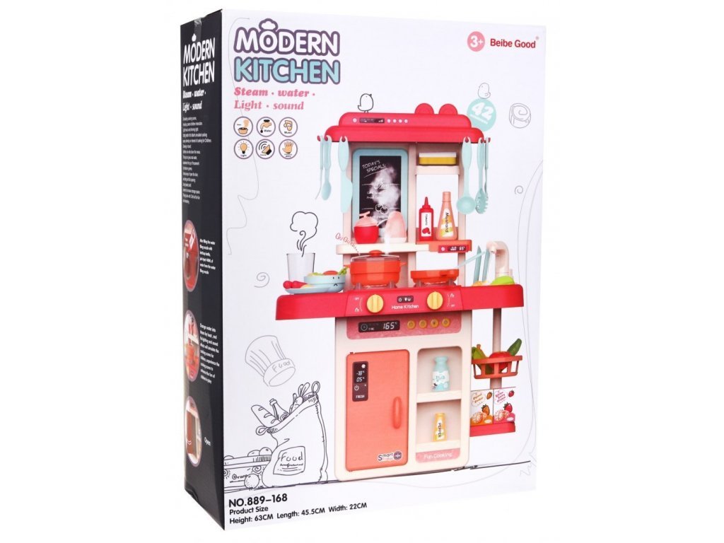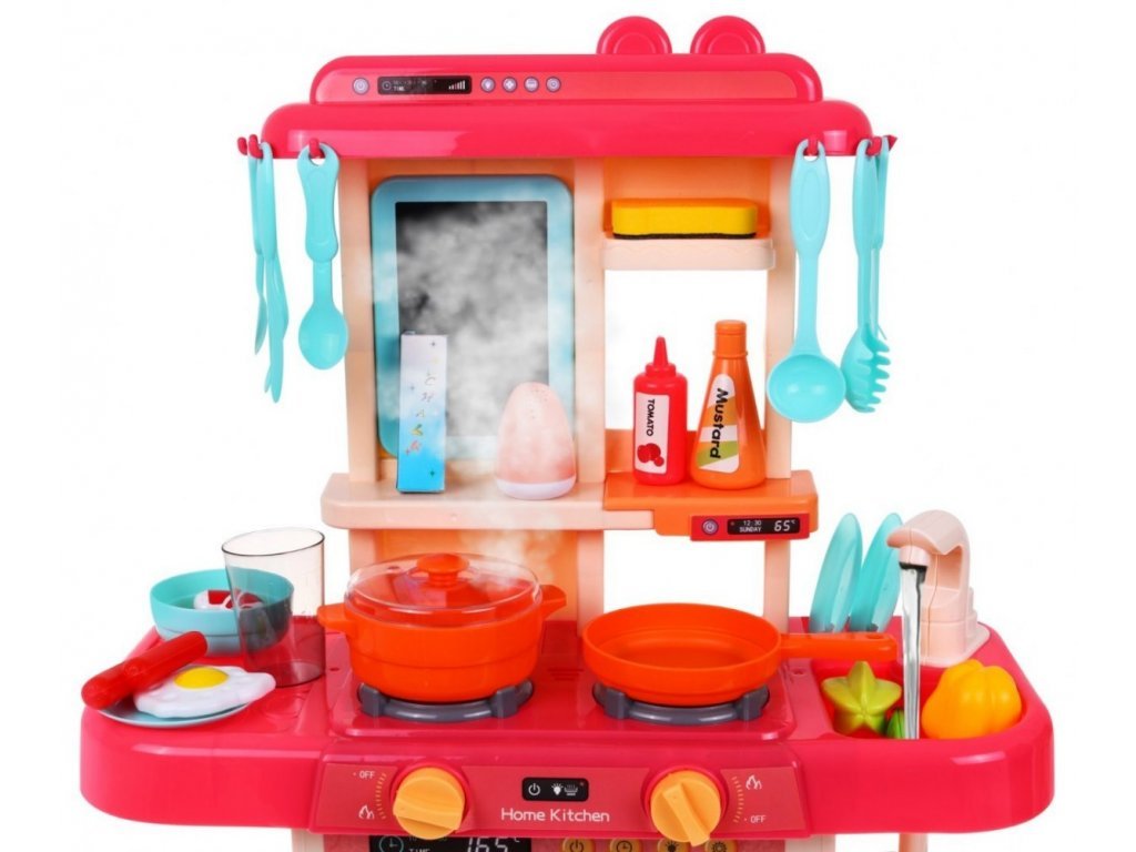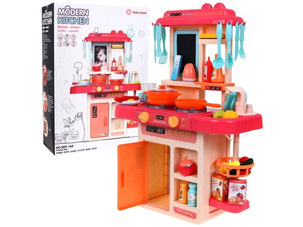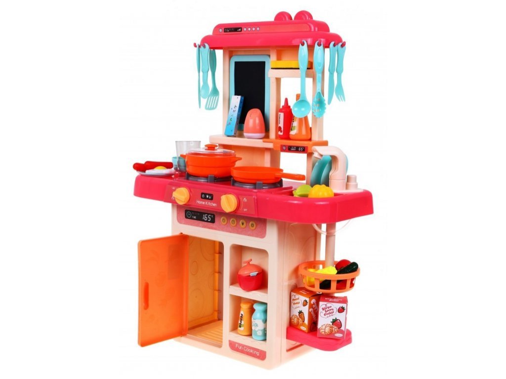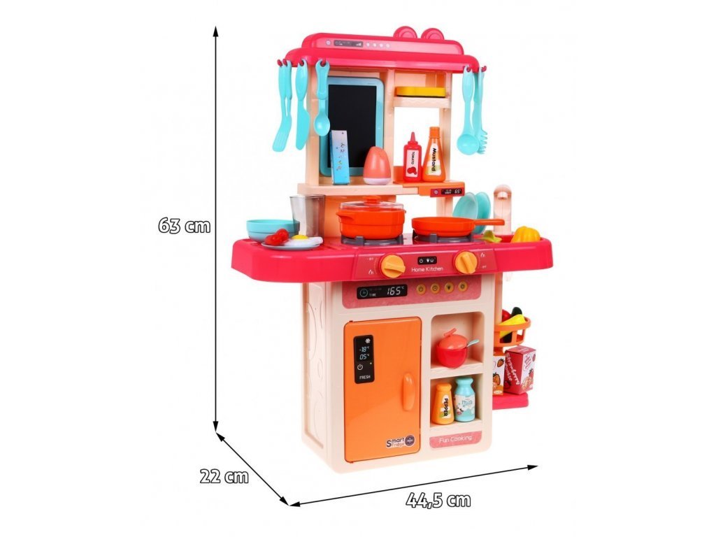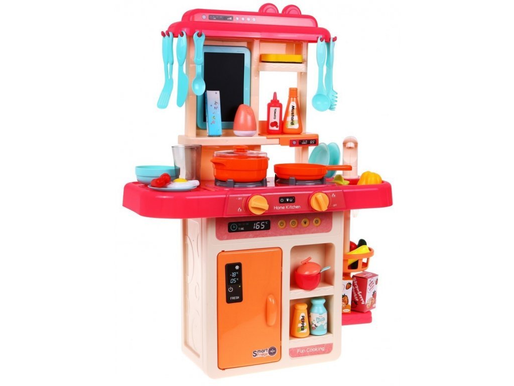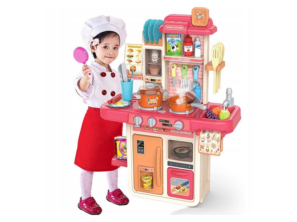 Az interaktív gyermekkonyha hangokkal, fénnyel, hideg gőzzel és folyó vízzel ellátott gyermekek számára készült 36 hónapos kortól. Összesen 42 elemmel van felszerelve, például evőeszközökkel, serpenyővel, salátástállal, fedeles edénnyel, készételekkel, gyümölcs- és zöldségfélék utánzatával és még sok mással. A bal oldali égőfej a hideg gőz hatását okozza kis mennyiségű víz felöntése után, így a főzés valóban valóságos lesz. Elöl található egy panel, ahonnan vezérelheti a hangokat és a fényhatásokat. Miután vizet öntött a mosogatóba és megnyomott egy speciális gombot, a víz folyni kezd és a gyermekek úgy mosogathatnak, mint egy igazi konyhában. Gyermeke biztosan nem fogja unni ezt a nagy konyhát. A sütő kinyitható. A rajztáblára a gyermek írhat például menüket. Kiváló minőségű műanyagból készült színes kivitelben.