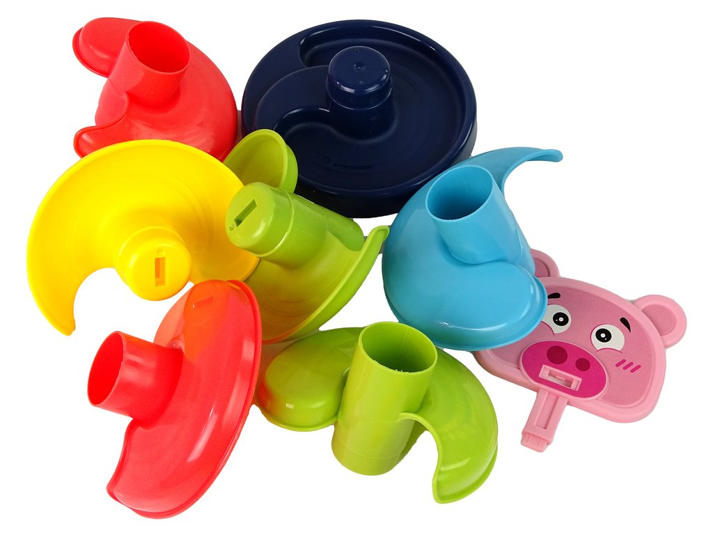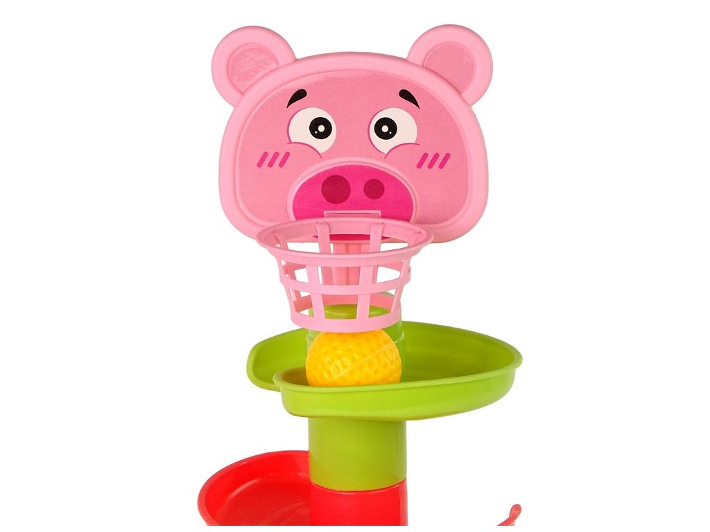Oktatójáték csúszda formájában, 6 emelettel. A felső részen egy malacka fej és egy kis kosár található. A labdák belsejében csörgő elemek vannak. A játék így fejleszti a gyermek látását, és egyben segíti a hallás serkentését. A színes golyókat az elkapási készségek edzésére, valamint a koordináció és az izomerő fejlesztésére használják. A játék minden eleme tanúsított és minősített műanyagból készül. 18 hónapos kortól ajánlott.
