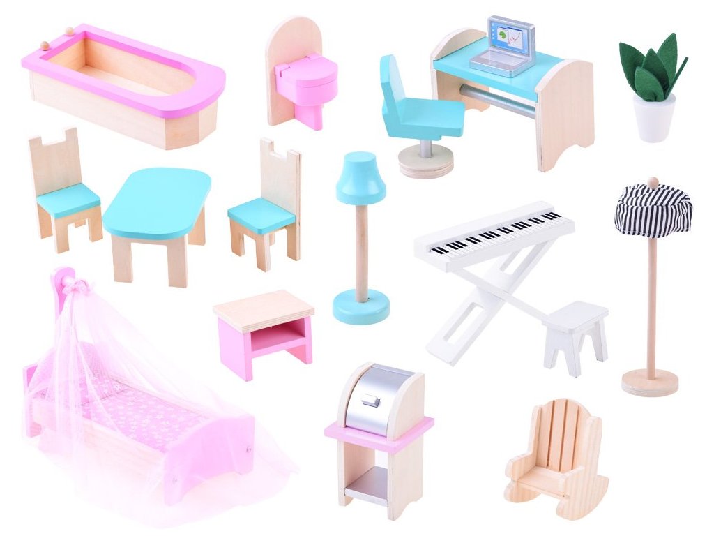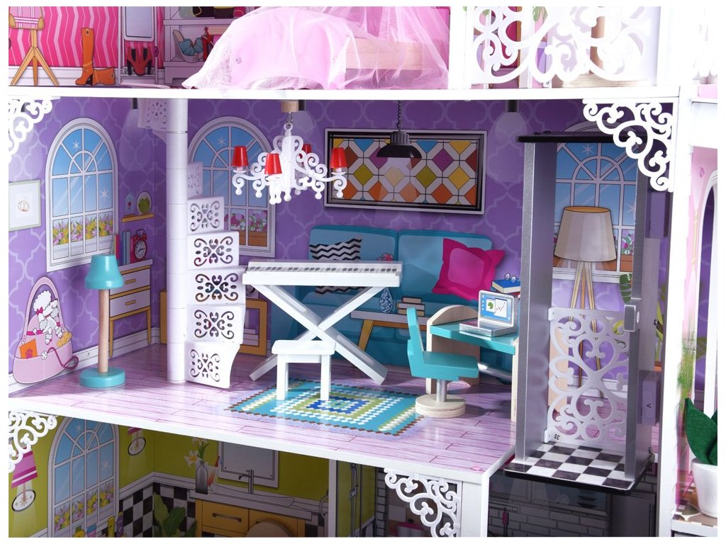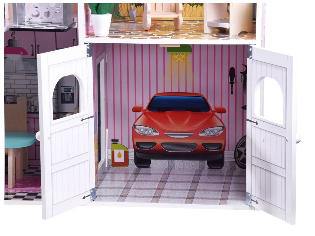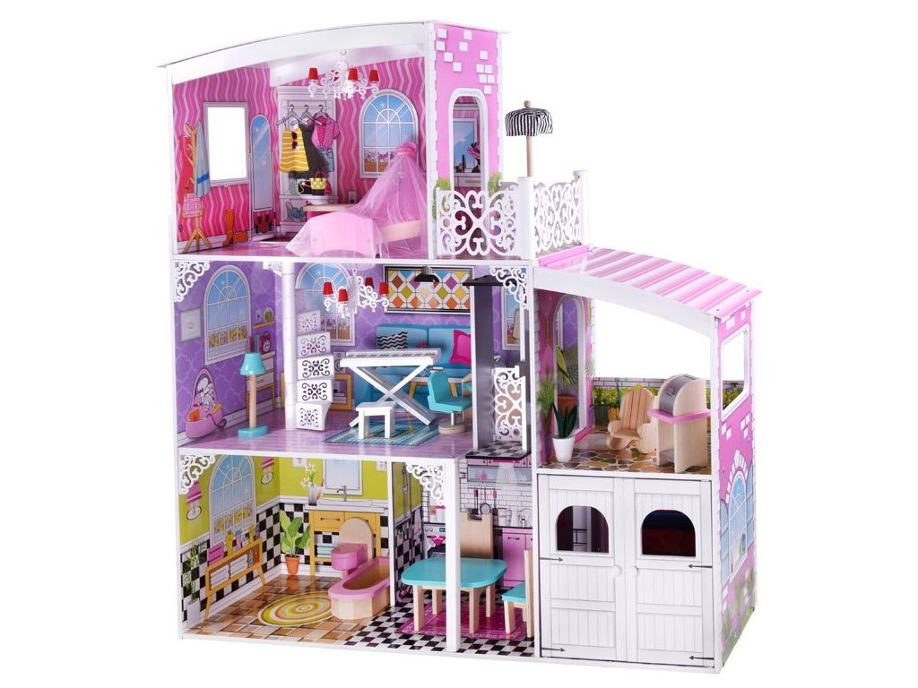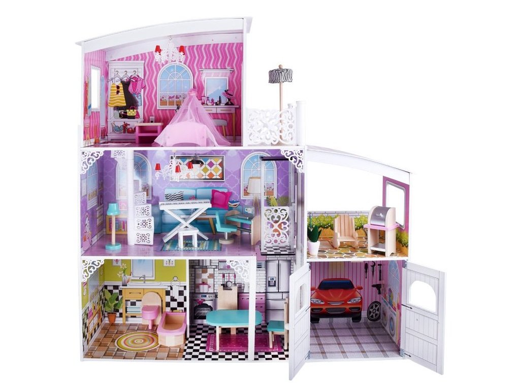 Melinda 3 emeletes babaház 4 szobával, erkéllyel, és nyitható garázzsal. A házikó részét képezi még a nagy fedett terasz. Az egész házikó valós hatású. Minden szoba más - más stílusban volt befejezve, a dekoráció, és a bútorok is a helyiségekhez vannak igazítva. A 16 db fából készült színes bútor kézzel volt simára csiszolva, lekerekített oldalakkal, hogy biztonságos legyen a gyerekek számára. Egészségre nem káros festékkel vannak befestve figyelve a legkülönbözőbb részletekre. A fa babaház kétség kívül az egyik legjobb választás ajándék szempontjából. Minden kislány álmodik egy ilyen házikóról. Az egyedi szép kialakítású házikó nem csak gyerekszobába, de még az ebédlőben is szépen mutat. 60 perc alatt a házikót össze lehet szerelni a használati utasítás, a megszámozott részek és a csillag csavarhúzó segítségével.