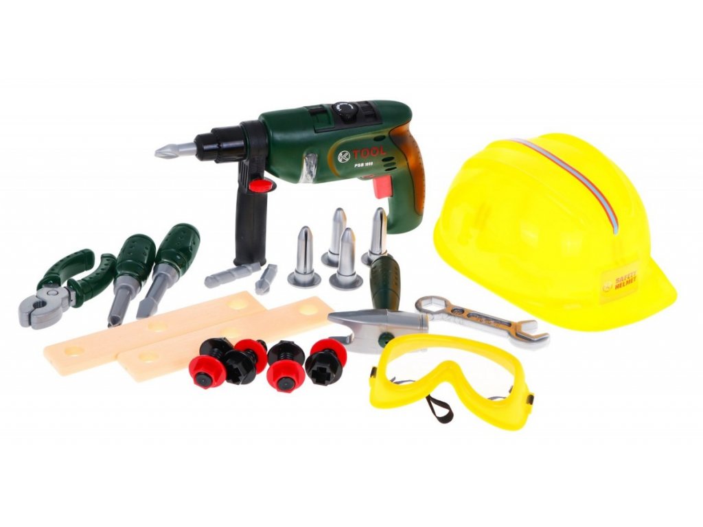 A nagyméretű műanyag Toolbox szerszámkészlet sisakkal, fúróval és szemüveggel ideális játék minden kis barkácsolónak. A készlet számos alkatrészt tartalmaz, beleértve a kalapácsot, villáskulcsot, csavarokat, fogókat, alkatrészeket, anyákat és egyéb szerszámokat. A készlethez tartozik még egy akkumulátoros fúró is, mely bekapcsoláskor jellegzetes hangot ad ki. A játék 36 hónapos kortól gyermekek számára készült.