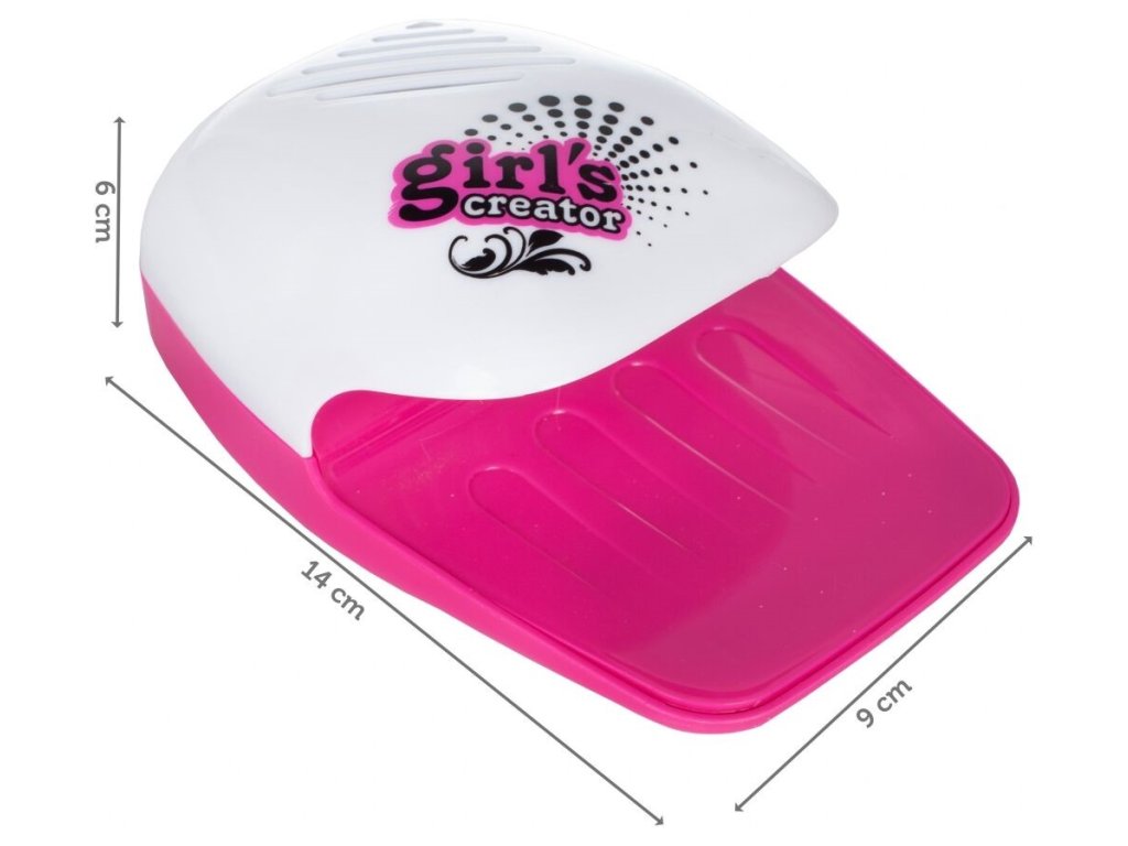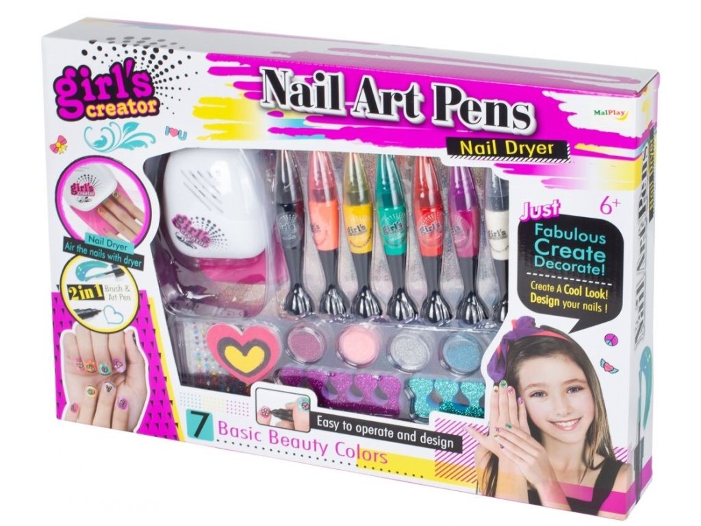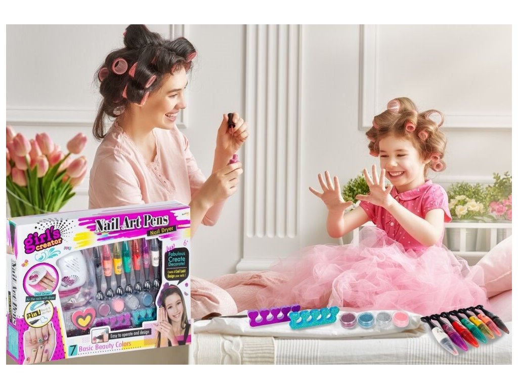 A Nail Art Pens egy teljesen felszerelt körömdíszítő készlet, minden szükséges tartozékot tartalmaz, mely szükséges a köröm ápolásához. A körömlakk lakkozó és egyben rajz ecsettel rendelkezik. A kislányok a készletben találják a csillámport, a cuki szívecske alakú körömreszelőt a pedikűrhöz elengedhetetlen lábujj elválasztó szivacsot, és az egyik legfantasztikusabb terméket az elemre működő körömszárítót, mely segítségével azonnal megszáríthatja a körmét. A készlet biztonságos, egészségre nem káros anyagokból készült. A körömlakk eltávolítása nagyon egyszerű, elég lehúzni a körömről. Nem szükséges körömlakk eltávolítót használni. A játék színes műanyagból készült. Használata 6 éven feletti gyerekeknek ajánlott.