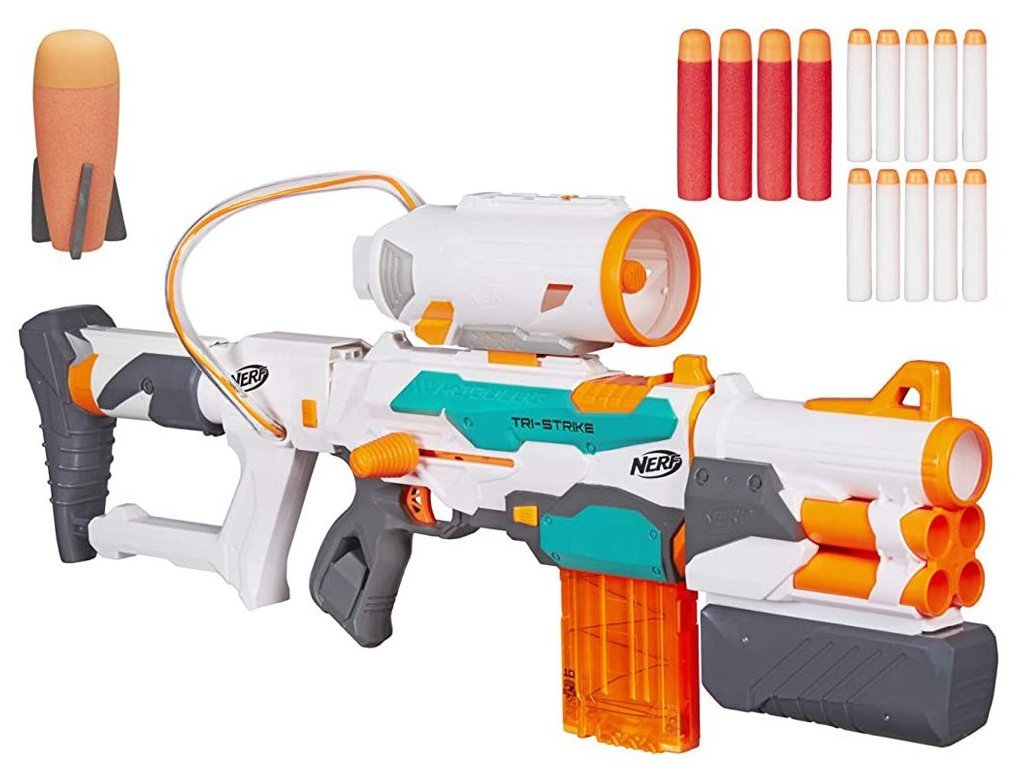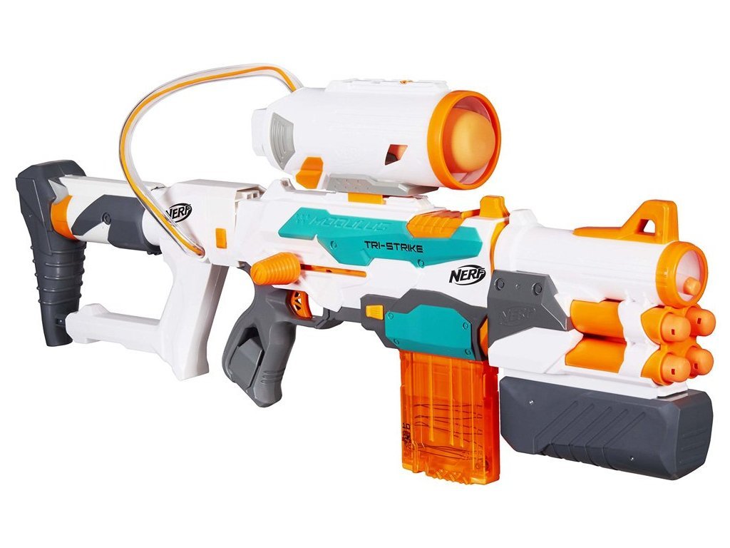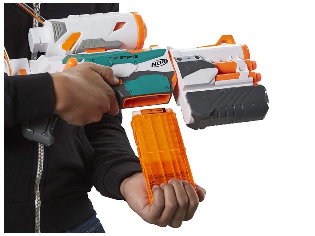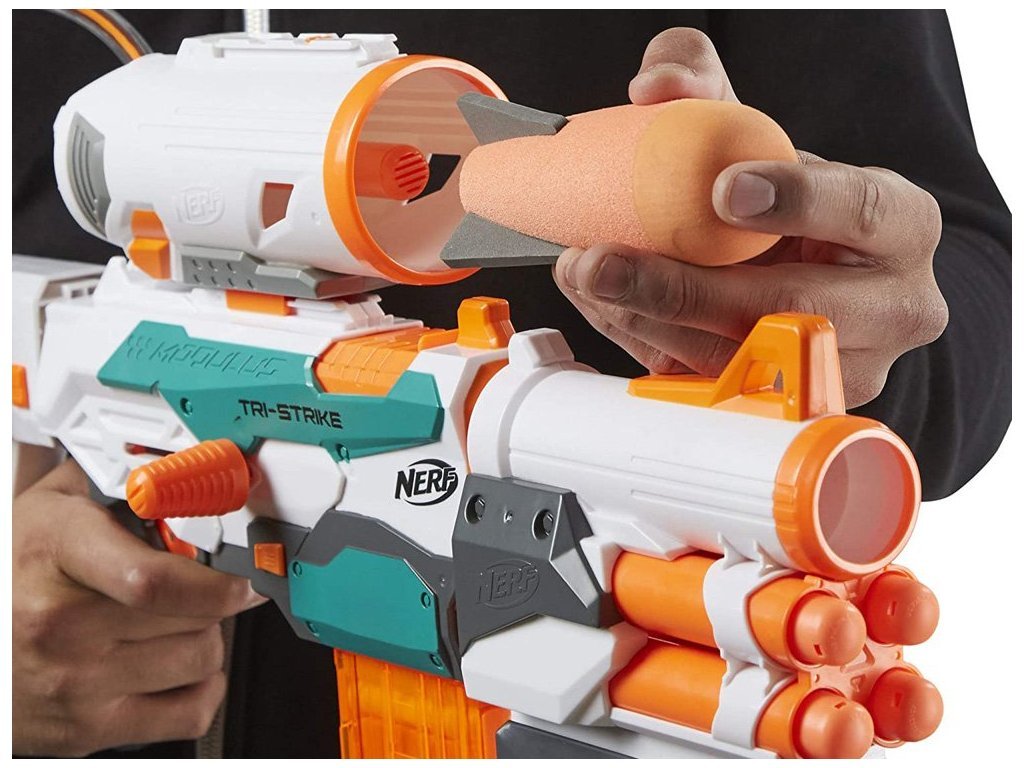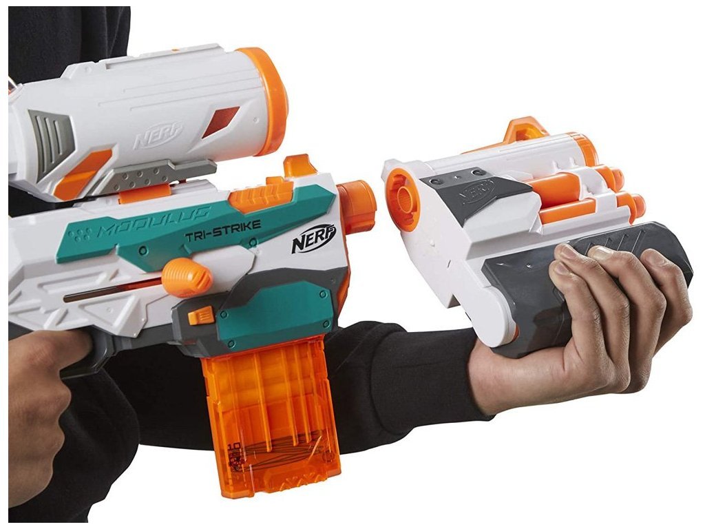 A multifunkcionális Nefr Modulus TriStrike hordozórakéta 10 Elite típusú tárhoz egy oldalsó felhúzással rendelkezik, ami megkönnyíti a fegyver betöltését. Két fantasztikus kiegészítővel van felszerelve - egy rakétavetővel, amely az állományhoz van rögzítve és taktikai rúdra szerelhető, és az állomány kézzel vagy vállával történő megnyomásával lőhető. A második lehetőség az, hogy a rakétavetőt a lövőcső végén helyezik el, és így meghosszabbítják. Az exponáló gomb megnyomásával egyesével lőszereket lőhet, vagy egyszerre kiürítheti az egész tárat. A Nerf Modulus rendszer lehetővé teszi a fiúk számára, hogy minden küldetéshez és cselekvéshez megfelelő fegyvert építsenek. A rendszer részeként kombinálható a sorozat többi fegyverével és tartozékával.