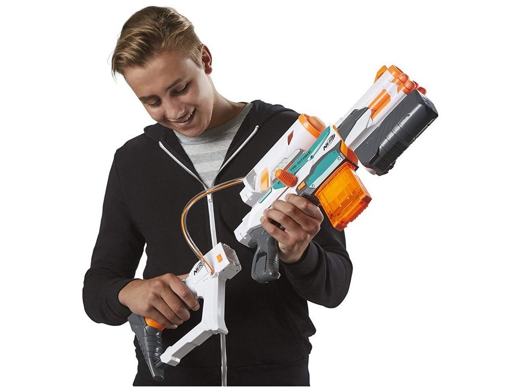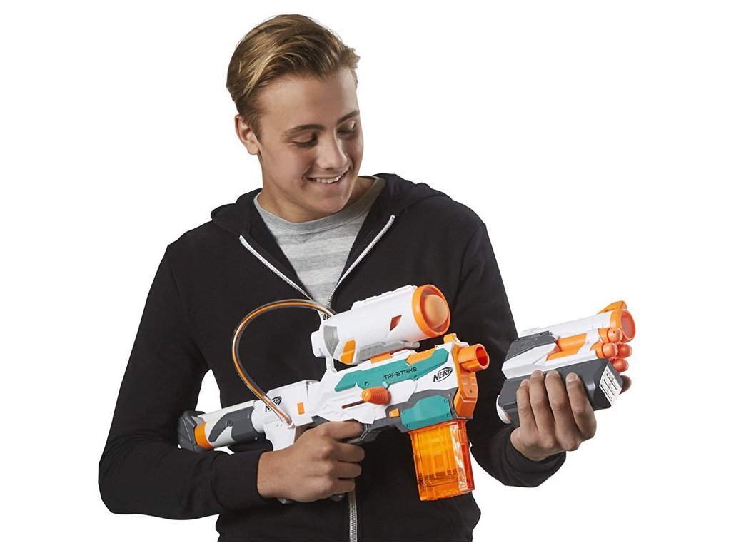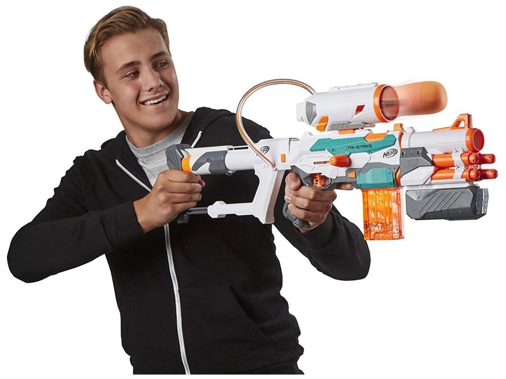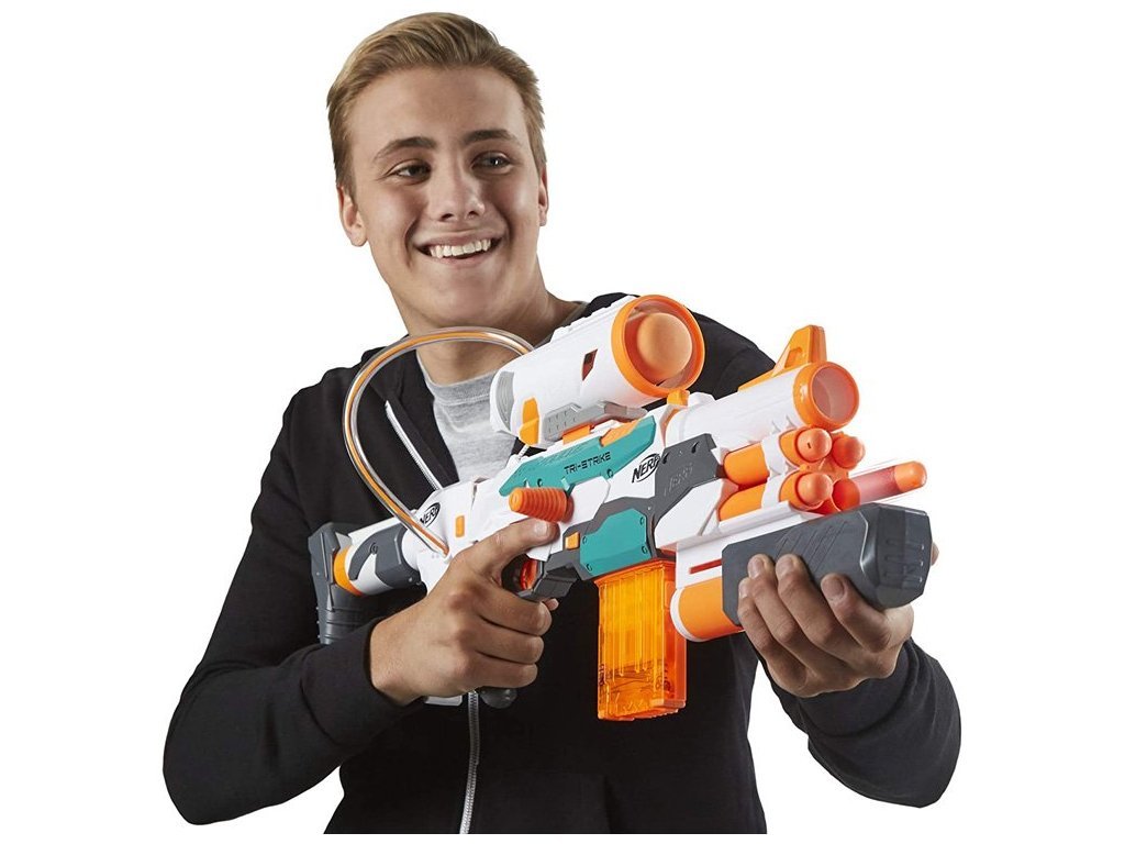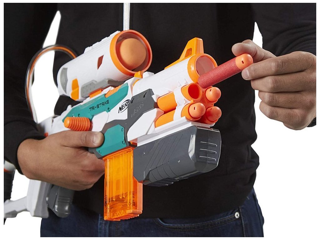 A multifunkcionális Nefr Modulus TriStrike hordozórakéta 10 Elite típusú tárhoz egy oldalsó felhúzással rendelkezik, ami megkönnyíti a fegyver betöltését. Két fantasztikus kiegészítővel van felszerelve - egy rakétavetővel, amely az állományhoz van rögzítve és taktikai rúdra szerelhető, és az állomány kézzel vagy vállával történő megnyomásával lőhető. A második lehetőség az, hogy a rakétavetőt a lövőcső végén helyezik el, és így meghosszabbítják. Az exponáló gomb megnyomásával egyesével lőszereket lőhet, vagy egyszerre kiürítheti az egész tárat. A Nerf Modulus rendszer lehetővé teszi a fiúk számára, hogy minden küldetéshez és cselekvéshez megfelelő fegyvert építsenek. A rendszer részeként kombinálható a sorozat többi fegyverével és tartozékával.