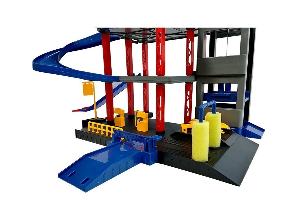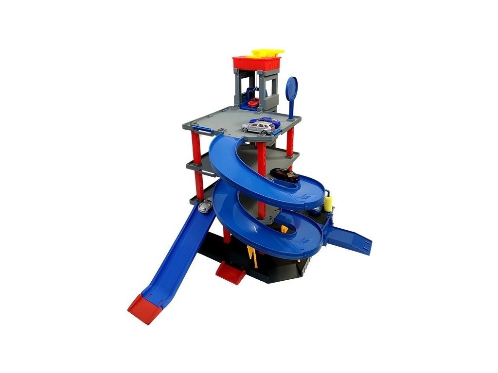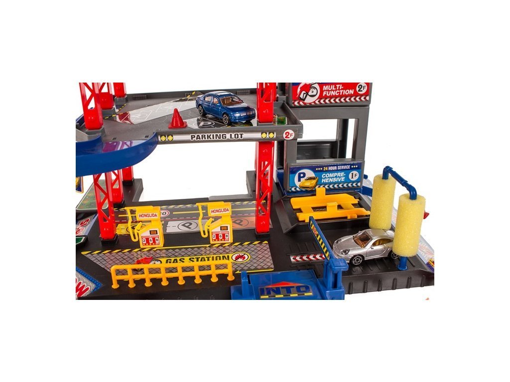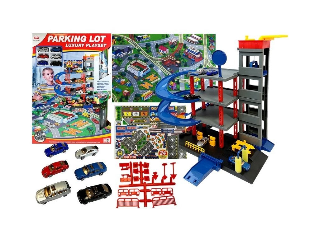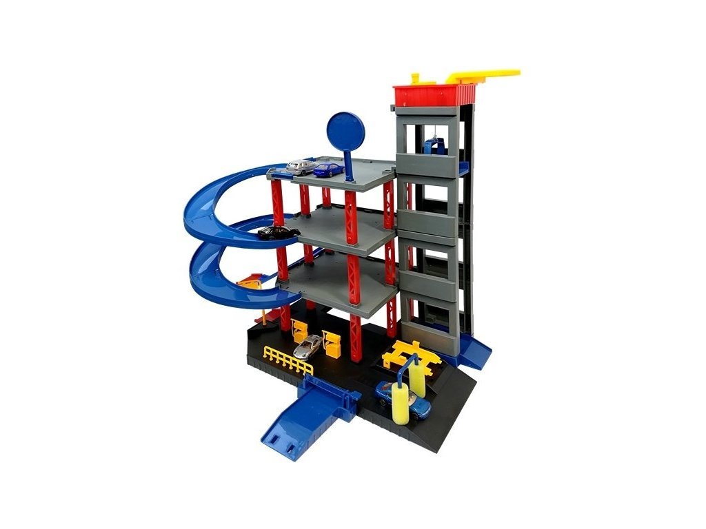Gyermek többszintes parkolóház 6 fém autóval és egy nagy játszószőnyeggel, utakkal. A parkolóház része egy mozgatható lift, amely lehetővé teszi az autók mozgatását az emeletek között, utca lámpák, a benzinkút, a helikopter leszálló területe és a közlekedési táblák. Az egyes emeleteket spirális út köti össze. Egy fiatal autós rajongó mindent megtalál itt, amire szüksége lehet. Kiváló minőségű anyagból készült, éles élek nélkül.