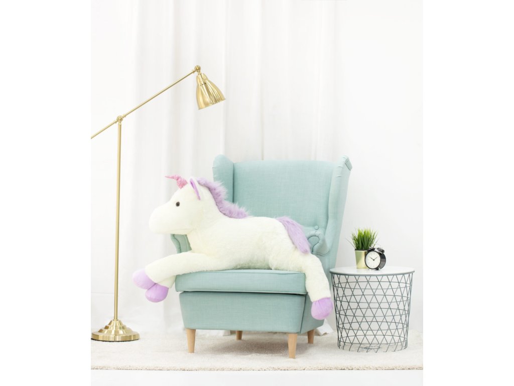 Nagy plüss egyszarvú Bruno minden gyermek álma. Kiváló minőségű és puha anyagból készült és nagyon jól meg van töltve kiváló minőségű plüssel, méretével minden gyermeket elbűvöl és vonz majd, de minden bizonnyal a barátnőnek is fog tetszeni születésnapi ajándékként vagy például Valentin-napra. Az egyszarvú magassága 120 cm.