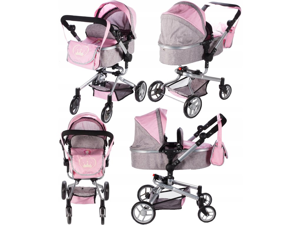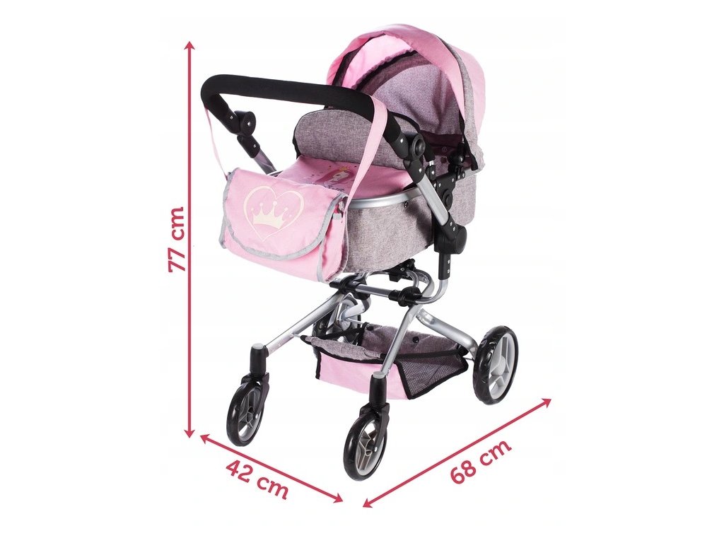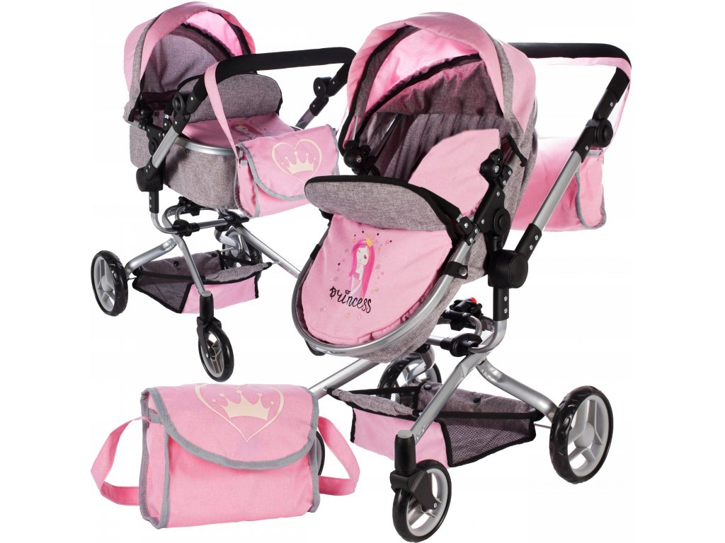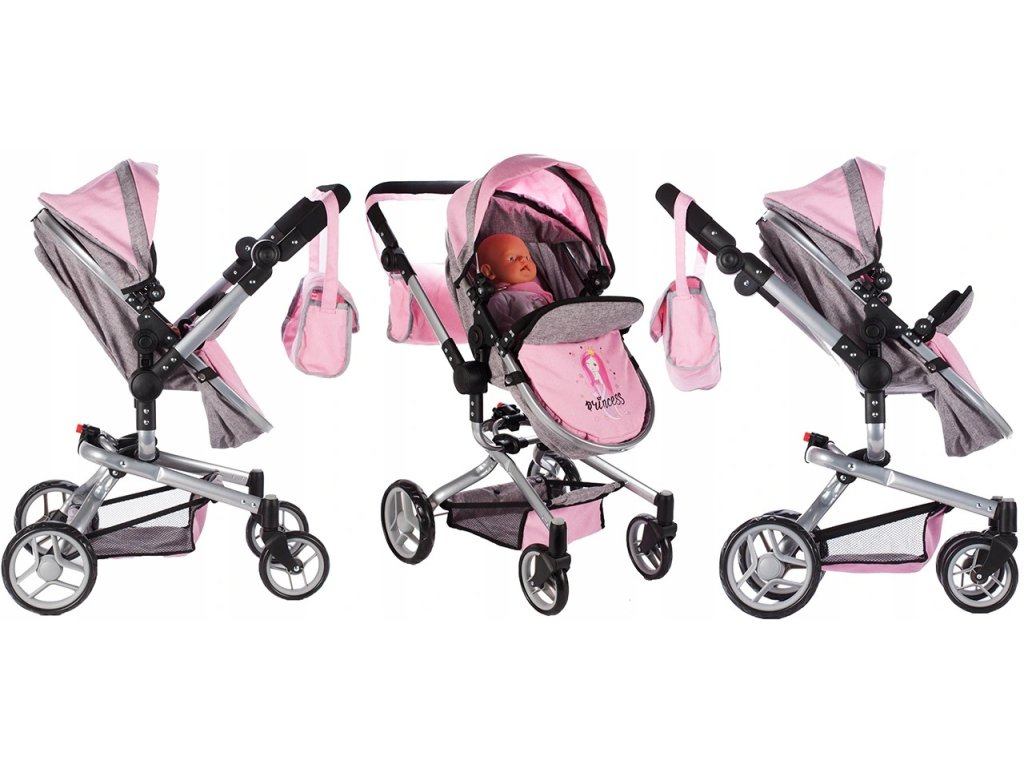 Princess 2 az 1-ben kombinált játékbaba kocsi. Könnyű stabil alumínium csövekből készült váz, a huzat impregnált pamutból készült. Bármikor levehető és kimosható. Az automatikus összezáródás elleni védelem védi a gyerekeket a sérüléstől. A sport verzióban biztonsági övek védik a babát a kieséstől. Egyszerű váltás a mély mózeskosárból a sport verzióra. Az alján egy praktikus bevásárló kosár található, és a kocsi részét képezi a felakasztható pelenkázó táska is.