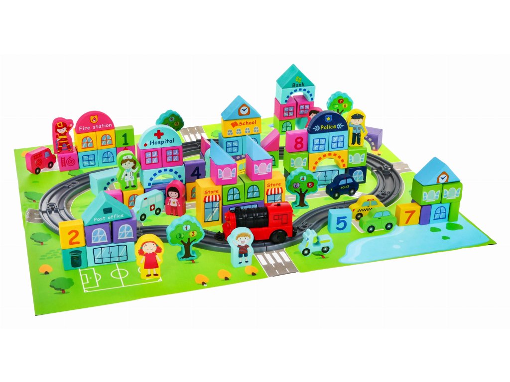 Railway Blocks színes fa kocka készlet színes város mintájú alátéttel vasúttal, és mozdonnyal. Minden eleme a játéknak fából készült, lekerített oldalakkal, különböző színű és méretű alakban. A kockákon különböző épületek, bábuk, fák és más alakok vannak felfestve. Az építőjáték több órás szórakozást biztosít gyerkőcének, és e-közben fejleszti a logikus gondolkodását, a fantáziáját, kézügyességét, kreativitását. A játék 36 hónapos kortól ajánlott.