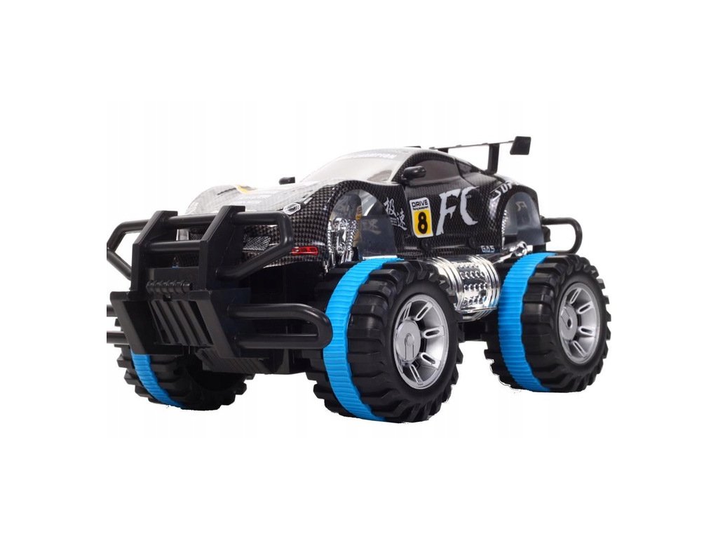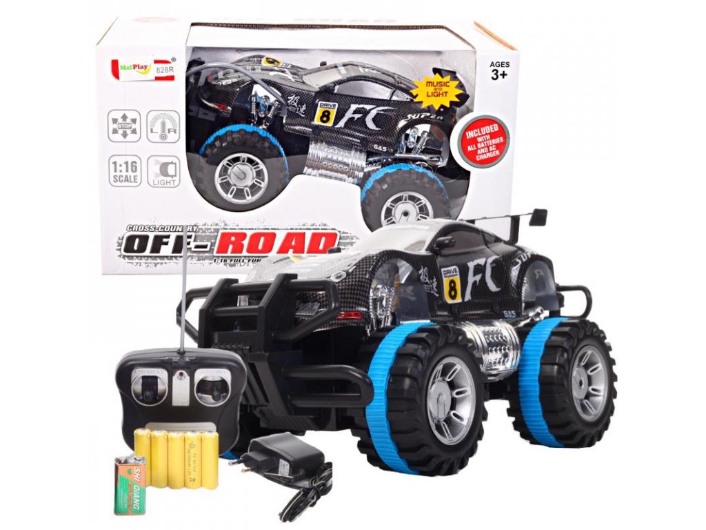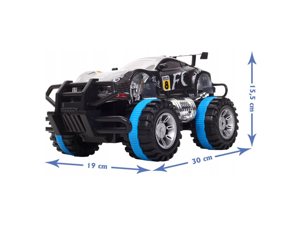 RC Offroad 27MHz frekvencián működő távirányítós emeltvázas autó lehetőséget ad az előre/hátra menetre és az oldalirányú forgásra. Nagy 8 cm átmérőjű gumi abroncsokkal rendelkezik jó tapadással. Az autó fény és hanghatásokkal van felszerelve(villogó fények az autó aljában) A csomag része a távirányító. Az autó ellenálló műanyagból készült CE tanúsítvánnyal rendelkezik.