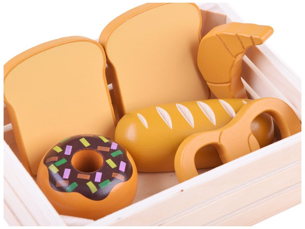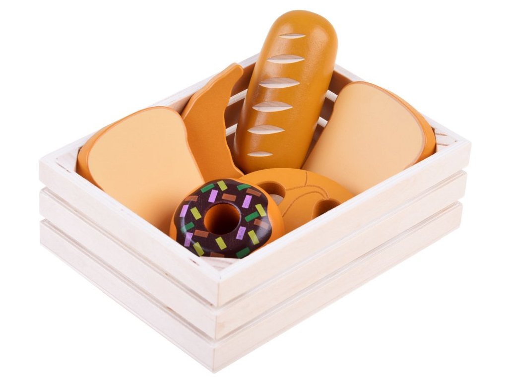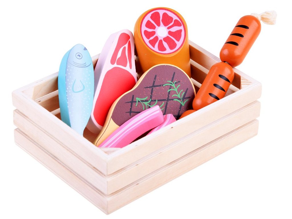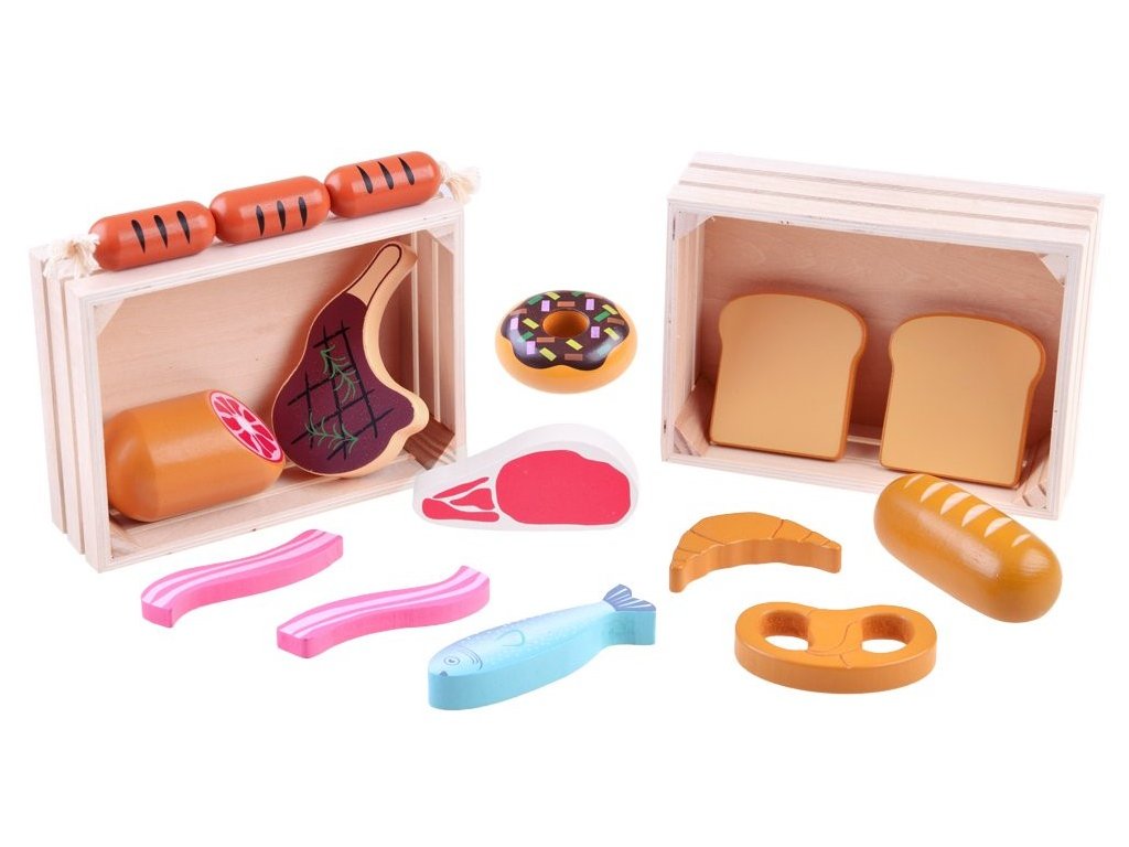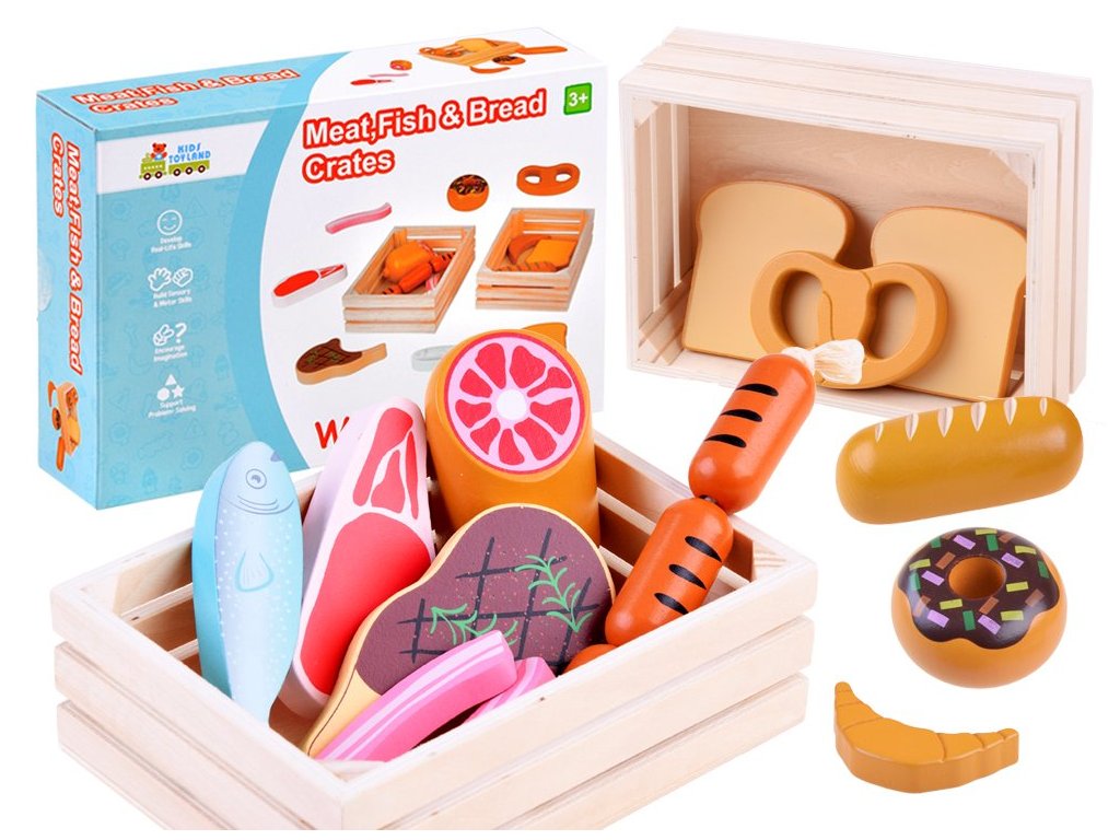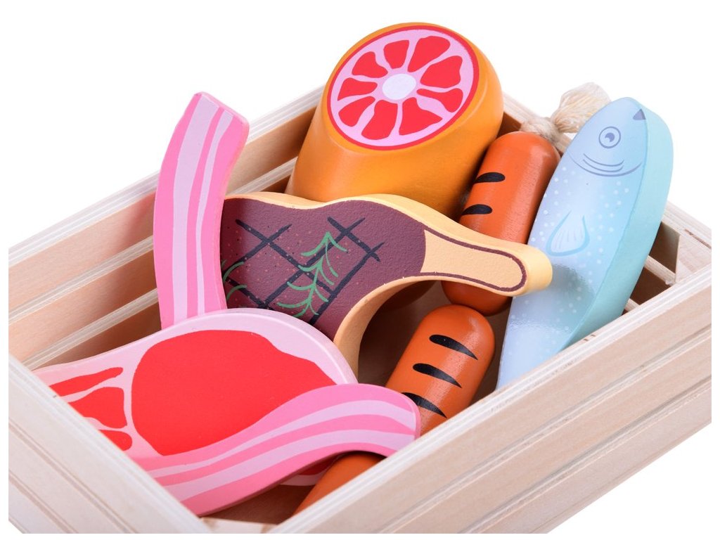 A Wooden Box szett bármilyen gyermekkonyhába beillik, vagy a gyermek önállóan játszhat vele. Minden fából készült, és nem veszélyes festékkel van bevonva. A készlet a legelterjedtebb ételeket tartalmazza, így a gyermek könnyen megtanulja felismerni őket. Minden praktikus fadobozban van tárolva. Ez a játék 3 éves kortól gyermekek számára készült.